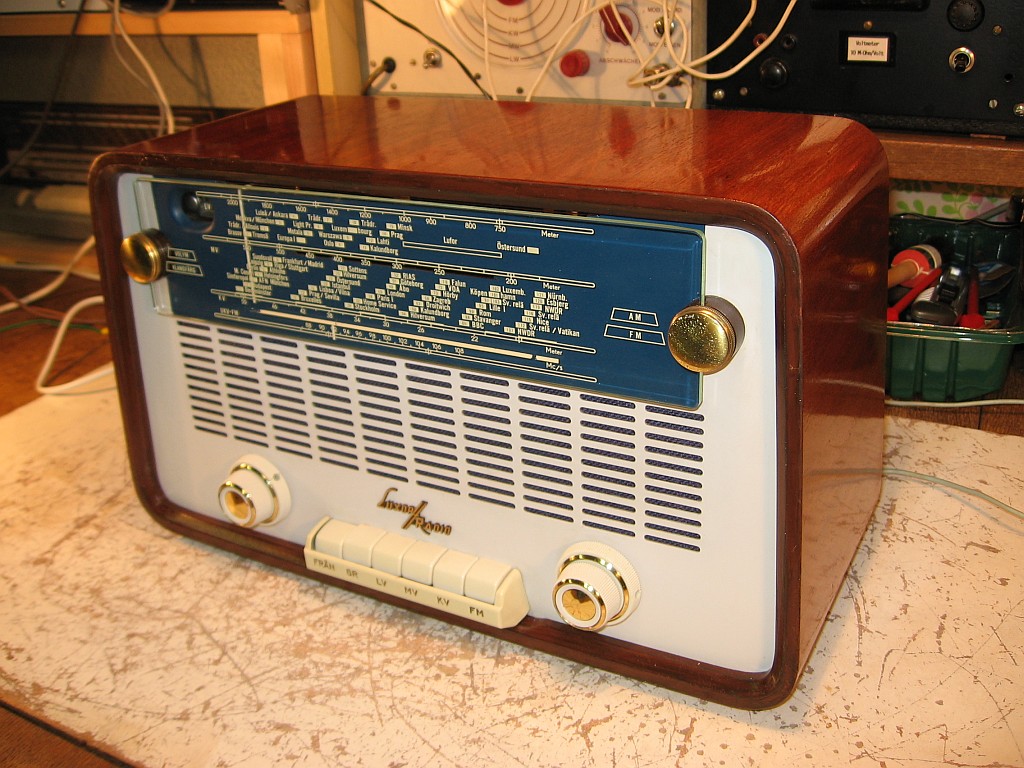 Für die Großansichten auf die Bilder klicken. Wie zu sehen ist, spiegeln sich die Gegenstände der Umgebung in der polierten Holzoberfläche. Den ursprünglichen Lack hatte ich nur angeschliffen. Beim Polieren hatte sich der Lack nicht gelöst. Bei einem Radio aus den 40er Jahren ist mir dies allerdings passiert, aber das hier ist Baujahr 1958. Ganz perfekt ist es nicht geworden, denn dort, wo der Lack beschädigt war, sind die Stellen dunkler. Durch die Spiegeleffekte fällt dies aber kaum auf. Ob das Radio ursprünglich so geglänzt hatte, ist die Frage. Ich nehme aber an, dass die Oberfläche glänzend war.