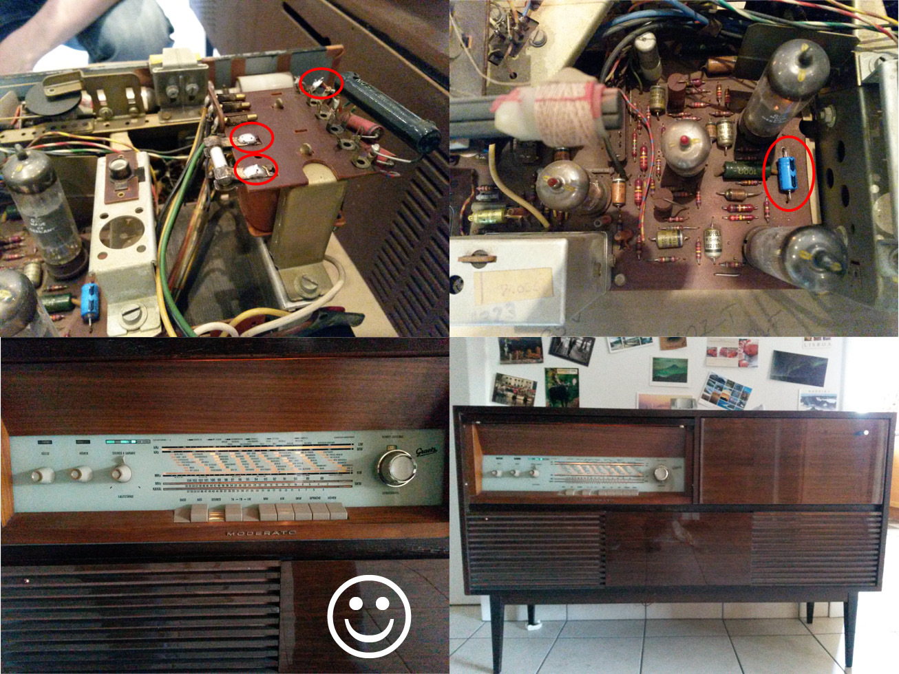 Anbei noch ein Foto von den defekten Lötstellen, dem getauschten Kondensator und dem wieder laufenden Gerät.