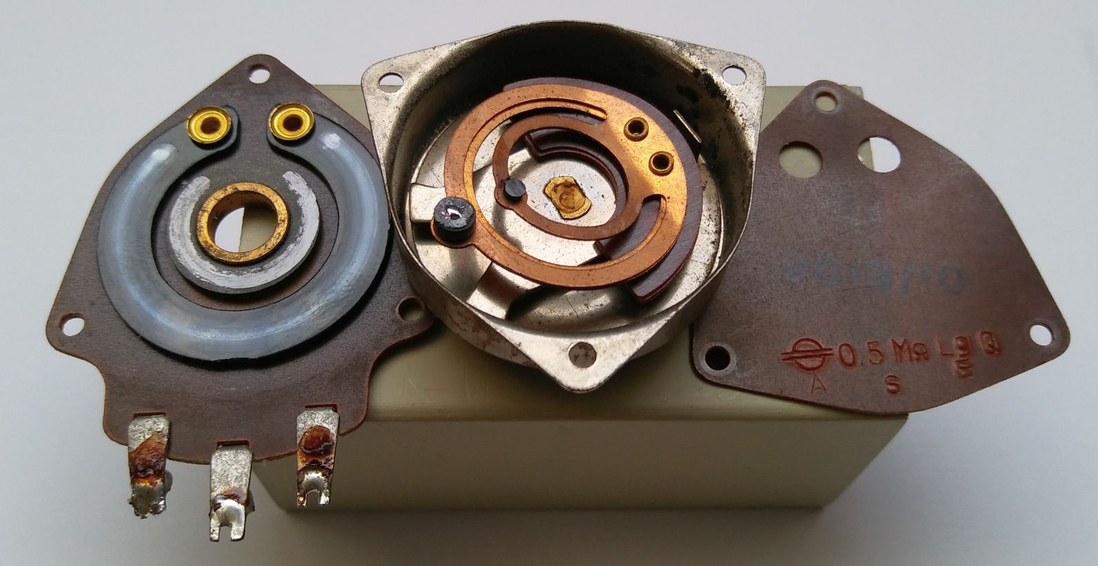 um den Körting Tourist zu vollenden, habe ich mich in Polen in vier Stoffläden umgesehen. Ich wollte schon aufgeben, da fiel mir ein Reststück von 1,6 Metern an Chenille-Möbelbezugsstoff auf, der dem Original noch am Nächsten kam. Leider machte das Lautstärkepoti erneut Probleme. Manchmal sprang die Lautstärke auf den Maximalwert und liess sich nicht mehr regeln. Ich hatte den Eindruck, dass die Benutzung der Kugellager-Kugel der Langlebigkeit der Widerstandsbahn abträglich ist, sodass ich mich zur Wiederbefüllung mit Quecksilber entschloss. Von den Bedenkenträgern im WGF nehme ich schon freiwillig und im Voraus die Schläge entgegen! Der Fehler lag in einem gebrochenen Niet am Ende der Widerstandsbahn. Sie war so wärmeunempfindlich, dass ich beide Nieten von beiden Seiten mit Lötzinn gefüllt habe.