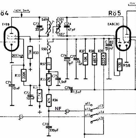 Von den Spulen im Ratiofilter geht keine an Masse. Der Primärkreis führt die Anodenspannung zur Röhre. Hier liegt kein Fehler vor. Die Sekundärseite führt zu den Dioden in der EABC80, die Mittelanzapfung dieser Wicklung wird über eine weitere Spule nach außen geführt. Hier wird das NF- Signal abgenommen. Auch diese Spulen dürfen keine Masseverbindung haben. Bitte kontrollieren, ob die Lötstellen in Ordnung sind und kein Schluß zum Abschirmbecher auftritt. Anbei noch ein Schaltungsauszug des Ratiodetektors, damit die Bezeichnungen S49 und S51 für alle, die keine Schaltung haben, klar sind.