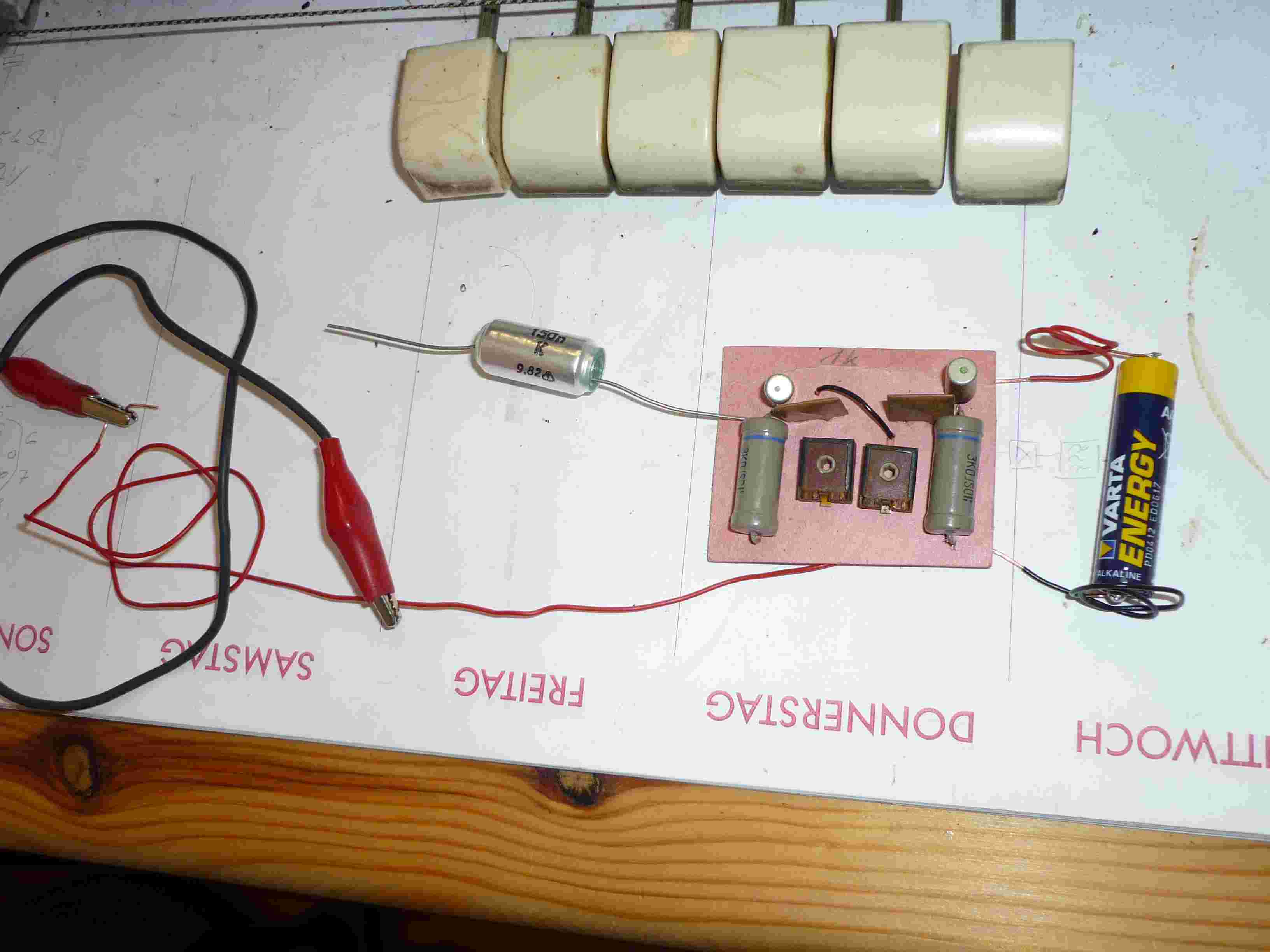 Das Skalenseil ist natürlich zwischdurch auch gerissen. Hab neues aus Segelgarn gefertigt. Zur Überprüfung des NF-Teils entstand nebenbei diese schöne Pappmultivibrator, alles was die Schrottkiste hergab.
