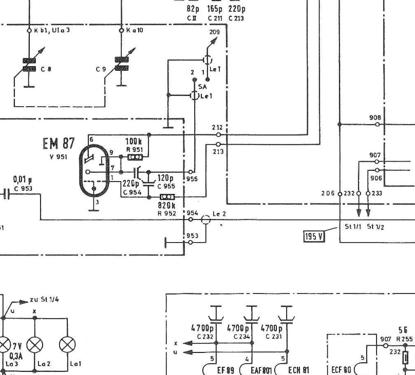 Aber ich habe noch nicht soviele Schaltpläne mit Röhrensockeln gesehen ich habe vor etwa 1-2 Jahren mal ein anderes Radio fertig gemacht, dort war es viel übersichtlicher. Der Schaltplan der mir hier vorliegt ist eine Zumutung. Kann vielleicht sein das früher alle so ausgesehen haben aber am Beispiel des Ausschnitts unten kann man sehen es geht auch anders. Und das Radio ist zwar etwas neuer aber troztdem sollte man wenigstens die zahlen vernüftig lesen ohne das die augen einen abstand von 30 centimenter zum Bildschirm herangezogen werden müssen.