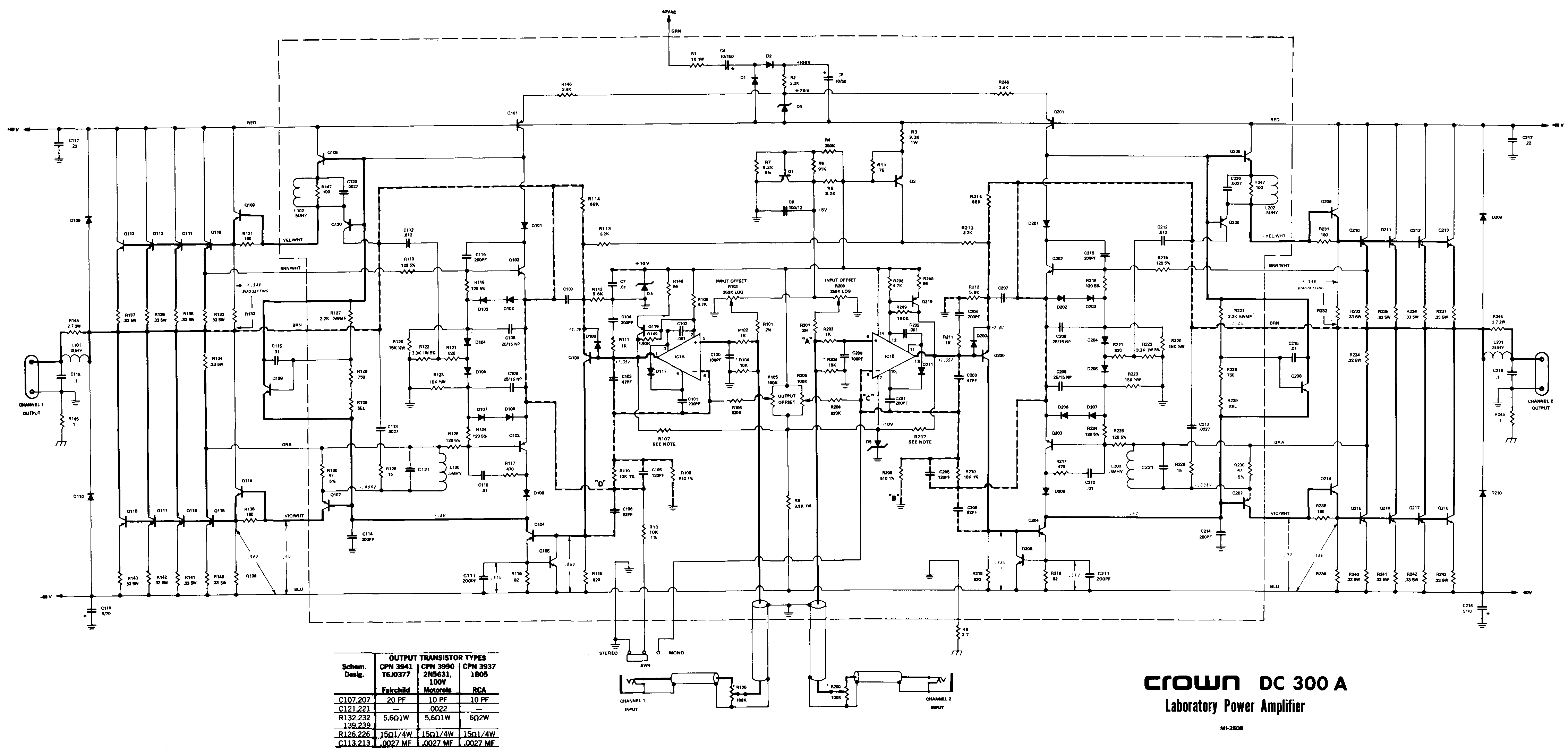 Hallo an alle Interessierten, hier anbei das Schaltbild einer meiner Stereoendstufen, hier Crown DC300A. Eine Endstufe die auch Gleichspannung verstärkt. Aufbau mit NICHT komplementären Endtransistoren, aber mit + und - Versorgungsspannungen gegen Null Volt (Ground) um den Ausgangselko zu vermeiden. MIt Gruß Sven