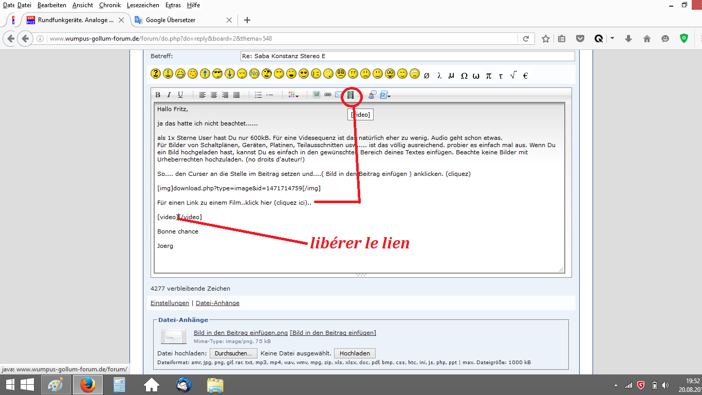 als 1x Sterne User hast Du nur 600kB. Für eine Videosequenz ist das natürlich eher zu wenig. Audio geht schon etwas. Für Bilder von Schaltplänen, Geräten, Platinen, Teilausschnitten usw..... ist das völlig ausreichend. probier es einfach mal aus. Wenn Du ein Bild hochgeladen hast, kannst Du es einfach in den gewünschten Bereich deines Textes einfügen. Beachte keine Bilder mit Urheberrechten hochzuladen. (no droits d'auteur!)