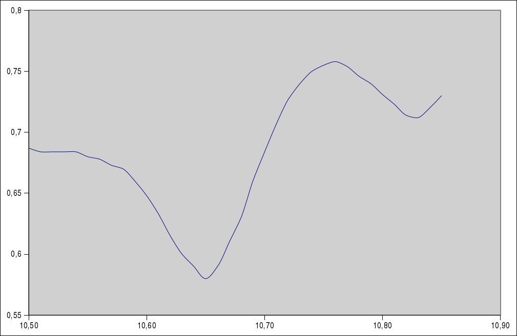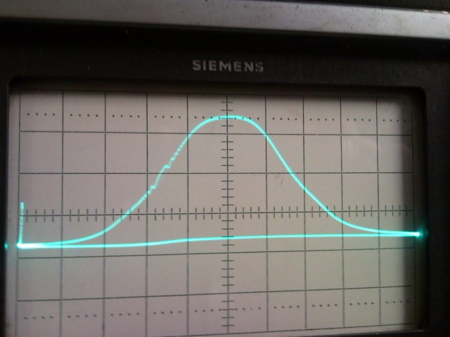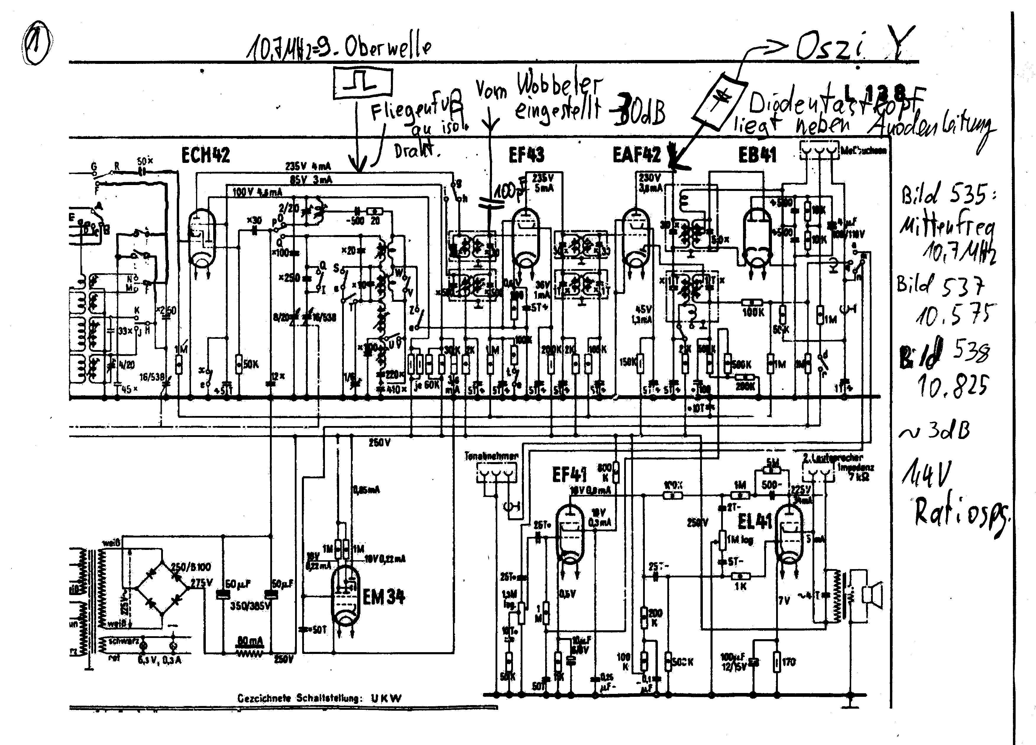 Ich hab mich mal gestern und Heute an die einzelnen Stufen heran gemacht. Hierzu habe ich den Schaltplan genommen und den Messaufbau dort skizziert, damit klar ist, was ich gemacht habe. Bild 1: Hier habe ich das Bandfilter zwischen EF43 und EAF42 gemessen. Das MEssendersignal wurde hier mit einem 100 pF Kondensator am g1 der EF43 eingekoppelt. Der Diodentastkopf liegt lose in der Nähe der Anodenleitung der EAF 42. Die Ratiospannung war bei den Messungen bei ca. 1,4 Volt. Die Marke wurde von meinem Rechteckgenerator (9. Oberwelle) erzeugt. Eingekoppelt wurde das Rechtecksignal sehr lose, indem ich mit einem Fliegenfuß die isolierte Anodenleitung der 1. ZF-Röhre ECH42 umgriffen habe. Bild 535 mit Marke bei 10,7 MHz:
