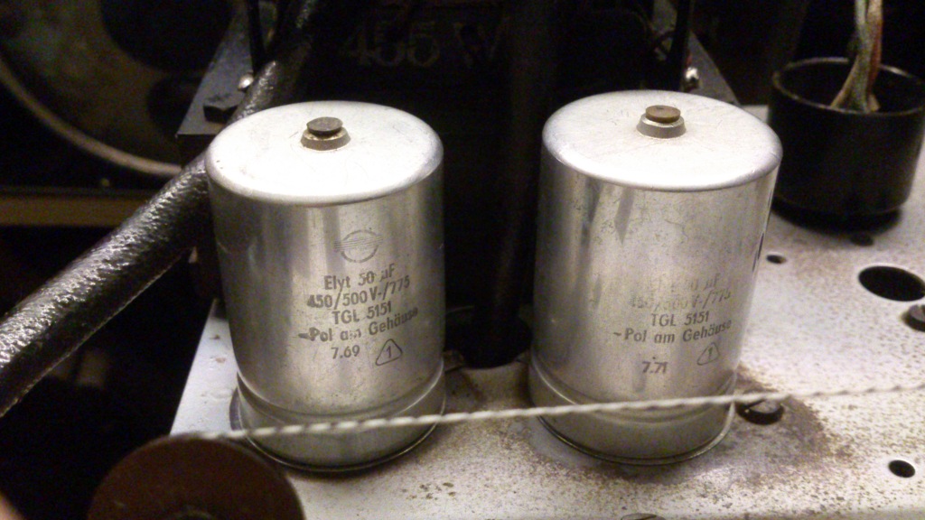 Auf einem der beiden Chassis waren noch zwei 'neue' Becherelkos drauf. Laut Datumaufdruck 1969 und 1971 hergestellt. Offensichtlich hat jemand an dem Chassis eine Reparatur durchgeführt. Nach etwas formieren habe ich das Ganze in Betrieb genommen und es läuft: