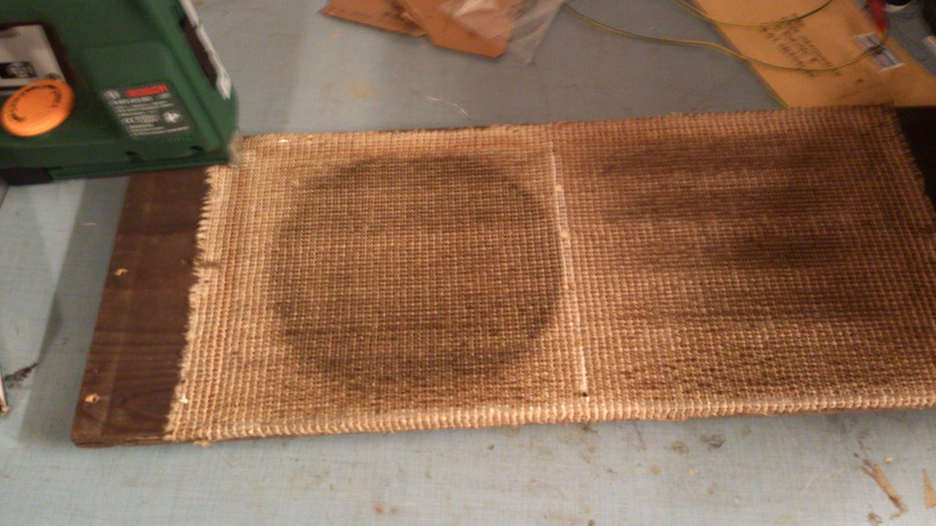 Lautsprecherstoff vorher (da sieht man auch, wie der Stoff vor dem Waschen festgetackert wird: Waschen dann mittels Schwamm und Waschmittel vorsichtig abreiben. Dabei die Schallwand nicht zu sehr durchnässen. Im Anschluss die Schallwand mit dem Stoff auf ein Handtuch legen und trocknen.