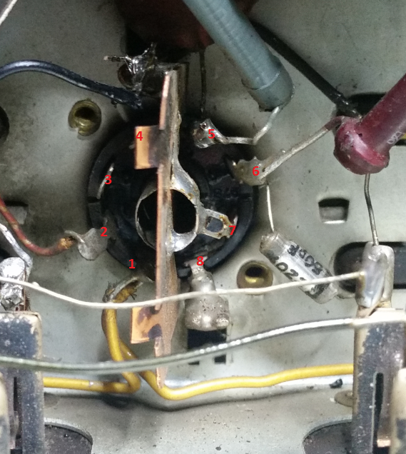 danke für die nochmalige Messung. Das schaffte Klarheit. So, da Du ja schon vorher bei der zweiten ZF-Stufe bei eingesteckter EF41 deren Steuergitter (auch immer gern als Gitter1 benannt) mit der Kathode der Röhre testweise kurzgeschlossen hattest (also nach meinem Röhrensockel-Bild Punkt 6 und 7) und sich die Schirmgitterspannung nicht heftig verringert hat, bleibt eigentlich nur die EF41 als defekt übrig oder z.B. die Röhrenfassungskontakte setzten aus oder einer der beiden Gitterableitwiderstände (1,6 M Ohm und 200 k Ohm) ist hochohmig geworden oder die Röhre heizt nicht oder es ist ein technisches Wunder entstanden.