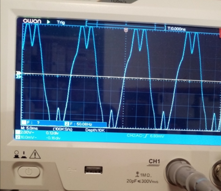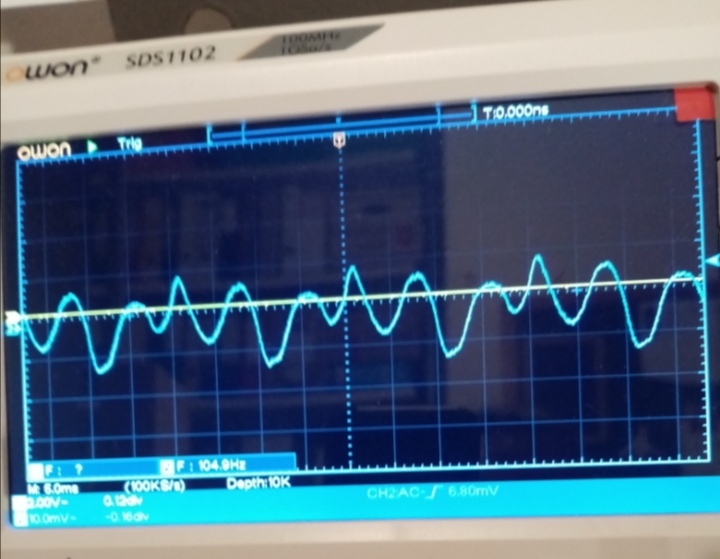 Hallo Jens und HB9, für die g1 Vorspannung der Vorröhre messe ich - 0,9V (Messgerät 5MOhm). Mit 100 nF oder 330 NF gegen Masse reduziert sich der Brumm erheblich. Die Bilder zeigen das mit Vertikalablenkung 10mV/Skalenteil. Es verbleibt 150 Hz Restbrumm.