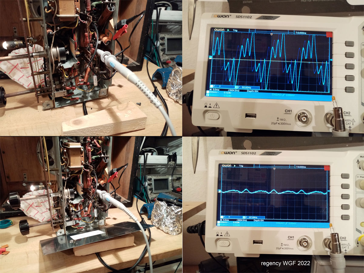 Was wohl feststeht ist, dass es vor allem Einstreuungen auf den Gitterkreis der Vorröhre sein müssen. Ob es die Röhre und ihr Sockel, Heizkreis oder das 20cm lange abgeschirmte und geerdete Kabel von den Vorwiderständen bis g1 ist, muss eindeutig geklärt werden. Das ist der nächste Schritt. Auch die Frage, ob der nachträgliche Einbau des UKW-Teils die Masse negativ verändert hat.
