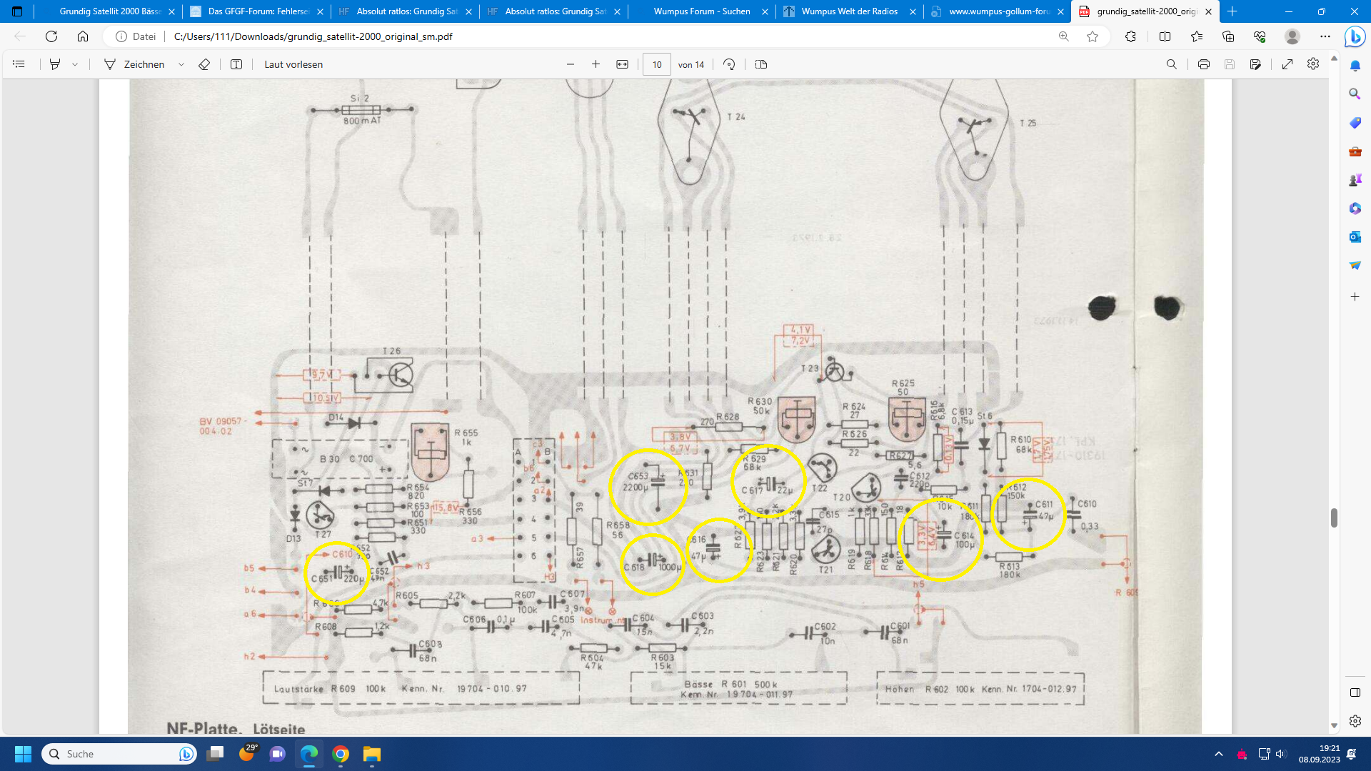 die 3 Schieberegler wurden ausgebaut und gründlich gereinigt (Tuner 600, Glasfaserstift). Anschließend wieder sorgfältig eingelötet. Die 7 Elkos auf der NF-Platte wurden gegen neue getauscht. Die übrigen 13 Kondensatoren geprüft/gemessen, alle OK. Alle relevanten Lötstellen wurden nachgelötet. Ruhestrom der Endstufe liegt bei 6,3 mA, also normal. Die Stabistoren ST 7 und ST 6 könnte ich noch mit Dioden/Widerstand parallel brücken, obs daran liegt glaube ich aber nicht.