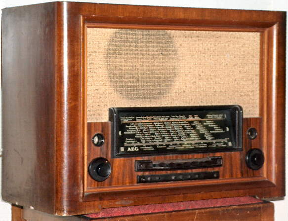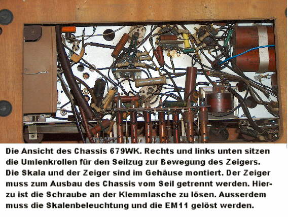 Hallo liebe Forumnutzer. Vor einiger Zeit reparierte ich einen Drucktastensuper des Typs 679WK, hergestellt 1939 von der AEG. Äußerlich machte das Gerät einen guten Eindruck und wurde in seinem Leben ausgiebig genutzt. Der in dem Gerät verbaute Röhrensatz war noch original und bot keinen Anlaß zur Beanstandung. Erforderlich war bei dem Gerät eine Reparatur des Seilzugs. Der Skalentrieb ist bei diesem Empfänger zweiteilig aufgebaut. Ein textiles Skalenseil übernimmt den Antrieb des Seillaufrades über den Abstimmknopf, ein Stahlseil mit dem Durchmesser von 0,22 mm übernimmt den Transport des Zeigers. Dieses Seil war lose im Gerät und hatte sich teilweise in den Wellenschalter hineingezugen. Ursache für diesen Fehler war eine Umlenkrolle. Diese war mit einem Winkel an das Chassis genietet. Die Niete hatte sich herausgezogen und damit lagen Niete und Stahlseil lose im Gerät. Eine weitergehende Untersuchung gab Aufschluß für den Grund. Der Zeiger wird durch eine Führungsstange innerhalb des Gehäuses geführt. Diese hatte Rost angesetzt und den Zeiger blockiert. Die beim Drehen des Abstimmknopfes auftretenden Kräfte zogen die Umlenkrolle aus ihrer Vernietung. Mit einer Schraube war das Problem beseitigt und das originale Seil für den Zeigertransport konnte wieder aufgelegt werden. Nachdem das Gerät in Betrieb gesetzt wurde, war ein guter Empfang auf allen drei Wellenbereichen vorhanden. Der Wellenschalter und das Drucktastenaggregat hatten nur geringe Kontaktprobleme, die mit Kontaktspray beseitigt werden konnten. Nach einiger Zeit war die Wiedergabe verzerrt. Der Koppelkondensator hatte einen Isolationsfehler und mußte ersetzt werden. Das blieb aber der einzigste elektrische Fehler. Selbst die Elkos im Netzteil hatten noch ihre Kapazität. Damit konnte die Arbeit an dem Gerät abgeschlossen werden. Die Urheberrechte an den Bildern habe ich.