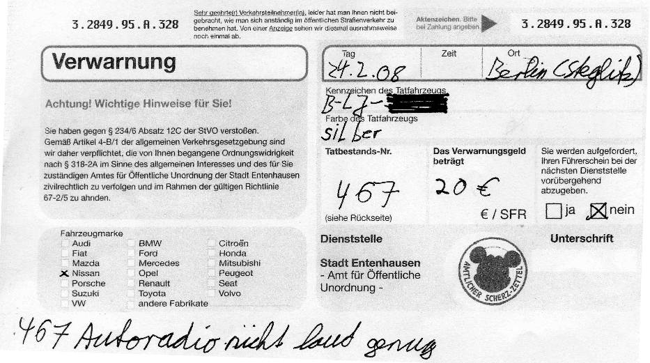 Deshalb erhielt ich heute eine Verwarnung mit einem Verwarnungsgeld in Höhe von 20 Euro, weil mein Autoradio nicht laut genug ist - Tatbestandsnummer 467 - (siehe Foto).