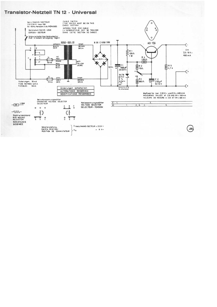 Hallo Ronn, seltsamer weise habe ich mich heute ebenfalls mit dem Grundig Netzteil TN 12 befassen müssen, im Gegenteil zu deinem, ist meins nach dem Lösen einer Schlitzschraube, auseinander Ziehbar. Der Fehler an meinem TN 12 ist, das die Ausgangsspannung je nach Belastung auch unterhalb der Max. 500mA pumpt und zwar um ca. 2,5 V. Auf der Suche nach der Schaltung, habe ich die Schaltung im RM.org verglichen und eine 100% ige Übereistimmung festgestellt. Nach der Messtechnischen Bauteilprüfung, stellte ich einen viel zu geringen Z- Strom der Stabidiode festgestellt, der Vorwiderstand ist Werthaltig. Morgen bekomme ich eine vergleichbare Z-Diode und berichte dann wieder.