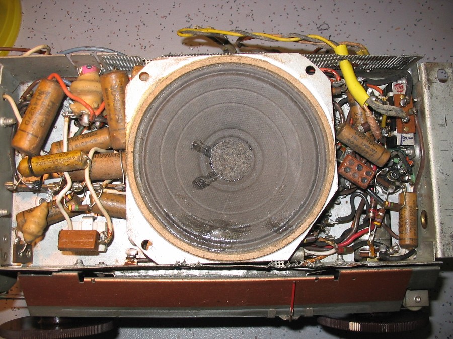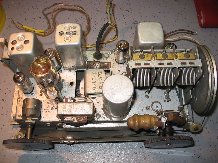 Hallo zusammen, ich habe vor einiger Zeit in dem bekannten internet Auktionshaus ein amerikanisches Philco 48-360 Röhrenkofferradio ersteigert. Hier nun der Reparatur Bericht: er beginnt mit Überraschungen; bei Demontage und erstem Überblick stellt sich heraus es handelt sich um ein Philco 46-350 und nicht um 48-360 mit der Konsequenz dass die nach Unterlagen beschaffte Endröhre 3LF4 falsch ist. Richtig wäre die 3Q5GT. Auf ihrer Position steckt dem Sockel nach eine Gleichrichter Röhre AZ 33 ( Nur 4 Stifte mit Sockel OC3 keine leserliche Beschriftung ) . Der Lautsprecher klemmt lose zwischen Chassis und Gehäuse. Die übrigen Röhren 1T4 2 X 1R5, 1U5 und 117Z3 haben allen intakte Heizungen und stecken auf den richtigen Positionen. Das Netzkabel ist abgeschnitten und ganz offensichtlich ist auch schon mal eine Batterie ausgelaufen. Die eingebaute Drahtantenne ist deshalb beschädigt. Soweit der erste Status, ich werde weiter vom Fortgang berichten sobald ich mir eine 3Q5Gt beschaft habe.