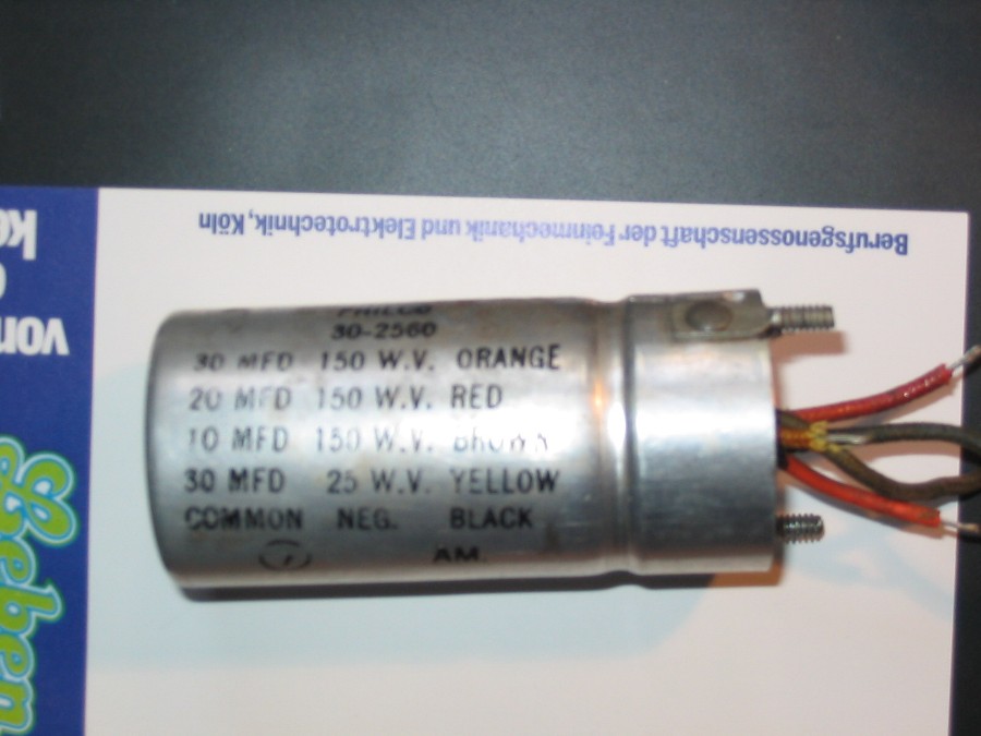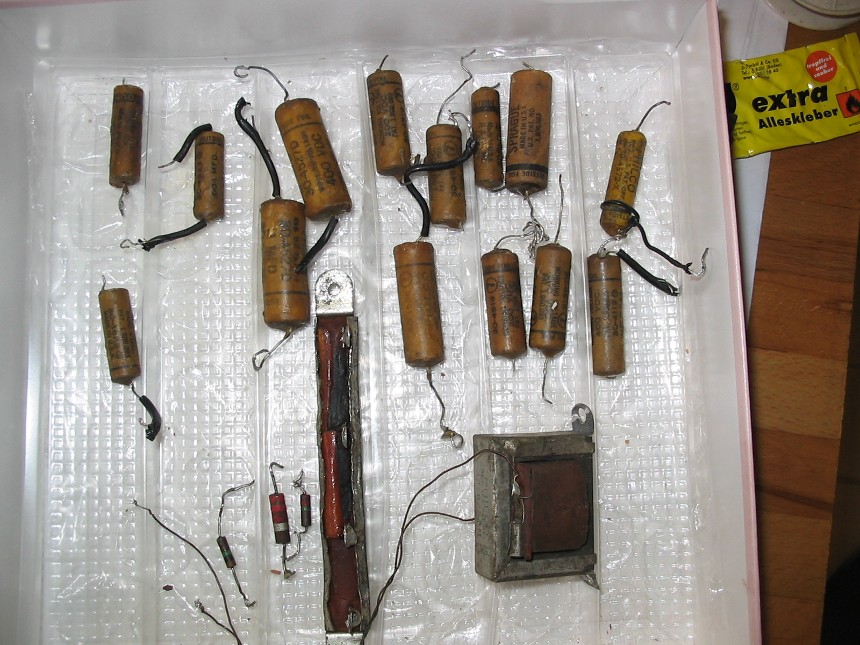 Hallo zusammen, der Philco funktionert nun labormässig wieder. Ich hatte noch nie ein Radio mit derartig vielen defekten Bauteilen . Im einzelnen sind dies: Ausgangsübertrager, 3facher Spezial widerstand ( 65/900/900 Ohm in einem Metallkörper zur Erzeugung u.a. der Heizspannung, 4fache Sieb/Elkokombi im Becher, 2,2 MOhm Widerstand zur Anodenspannungserzeugung, div weitere hochohmig gewordene Widerstände sowie alle C´s die teilweise scheinbar doppelte Werte aufwiesen, u. 2 davon Kurzschlüsse hatten. Ausserdem fehlte ein Widerstand von der Mittelanzapfung der 3Q5GT ( Endrö.) zu Masse. Die nächste Herausforderung wird sein, die labormässige Widersandskombination durch ein Konstrukt zu ersetzen, das in den dafür vorgesehenen Platz unter dem Skalentrieb passt. Bei den geringen Abmessungen ist das nur mit Hochlastwiderstände zu erreichen, die die Abmessungen von Transistoren haben. Diese Dinger sind leider schweinemässig teuer ( ca 50 € für die Kombi ) Die Bilder zeigen den laborm. Zustand und die Sammlung der def. Teile Grüsse Jürgen H.