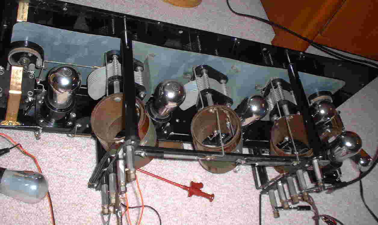 Ich habe mal ein Tonsignal (aus meinem Tape-Deck) geholt und an den zweiten NF-Trafo (primärseitig) angelegt; hierbei konnte ich feststellen, daß eine NF-Verstärkung stattfindet. Auch konnte ich, als ich das Gitter der Röhre des dritten Kreises (original-Bezeichnung: "2nd Neutrostage") berührt habe, ein Brummen vernehmen. Mehr ist aber nicht mehr drin (s.o.).
