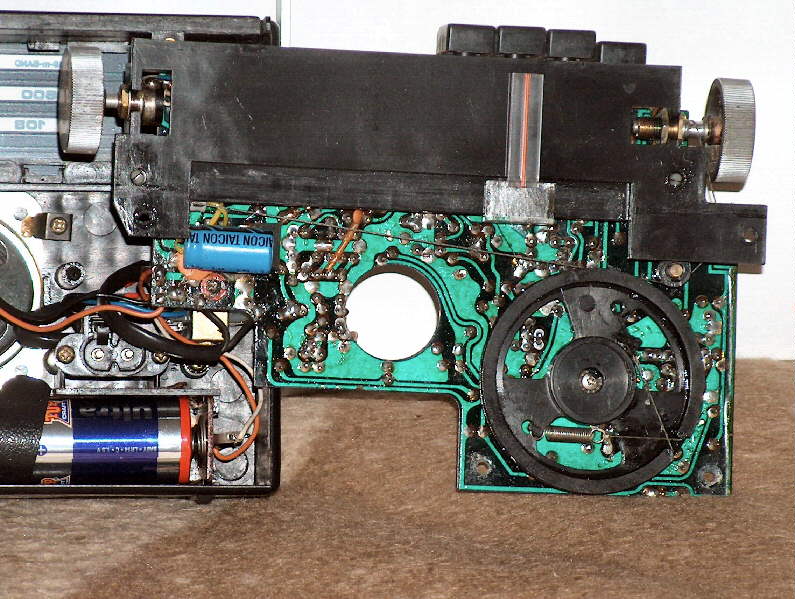 Vor kurzem kam ich in den Besitz des Koffersupers Cambridge 303 von Nordmende. Dieses kleine Gerät bringt etwa 1 kg auf die Waage, empfängt UKW bis 108 MHz, das 49m- Band der Kurzwelle und den Mittelwellenbereich. Ein Netzteil ist eingebaut, ansonsten übernehmen 4 Zellen R14 die Stromversorgung. Die eisenlose Endstufe steuert einen kleinen Ovallautsprecher an. Klangliche Wunder sind von diesem kleinen Gerät nicht zu erwarten, die Tiefenwiedergabe ist etwas benachteiligt. Das Gerät kann man in dieser Hinsicht zwischen einem Taschensuper und einem Reiseempfänger einordnen. Der Aufbau des Gerätes erfolgte auf einer Leiterplatte, die den gesamten Funktionsinhalt trägt. Der UKW- Tuner ist ebenfalls in "Wachskleckertechnik" mit Luftspulen ausgeführt, dem Spardesign kommender Geräte. Nach kurzem Betrieb ließ sich die Sendereinstellung nicht mehr betätigen. Ursache war eine fehlende Haltenase am Seillaufrad. Es stellte sich heraus, daß diese vom Vorbesitzer schon einmal geklebt wurde. Eine dauerhafte Problemlösung wurde mittels einer Seilschlaufe, die durch eine am Seillaufrad vorhandene Bohrung geführt wurde, geschaffen. Weitere Probleme bei der Instandsetzung hat das Gerät nicht bereitet.