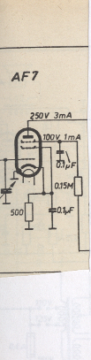 Hallo zusammen, mir ist ein Zwei- Kreis-Reflexempfänger Lumophon WD 327 zugeflogen. Bei der ersten groben Übersicht, auch über die bei mir vorhandenen Schaltungsunterlagen, ist mir eine Merkwürdigkeit an der Beschaltung der AF7 aufgefallen, die sich ebenfalls in der Schaltung der CF3 des GW 327 wiederfindet. Im angefügten Schaltungsausschnitt könnte man glauben Schirm- und Bremsgitter wären vertauscht. Allerdings findet sich die gleiche Situation im Allstrommodell GW 327. Ist jemand mit dem Empfänger vertraut und kann mir die Funktion erklären falls das so richtig dargestellt ist. Grüsse Jürgen H.