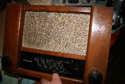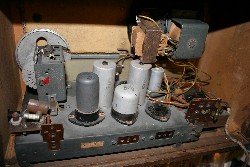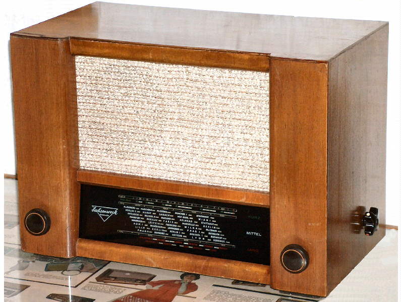 Ihr seht bei den Anhängen neben dem Frontfot zwei Blicke ins Innere und die zerstörte Röhre. Da, wo ich den Stift reingesteckt habe, saß die AZ 11, die zerstörte vorn in dem dunklen Steckplatz(vorn aus Sicht des Betrachters). Typen-oder sonstige Bezeichnung ist nicht zu finden. Wellenbereiche 6-18 Mhz,550-1600 kHz,150-so 300 kHz (laut Skala). Zwei Drehknöpfe vorn, ein kreuzformiger Drehschalter an der Seite.