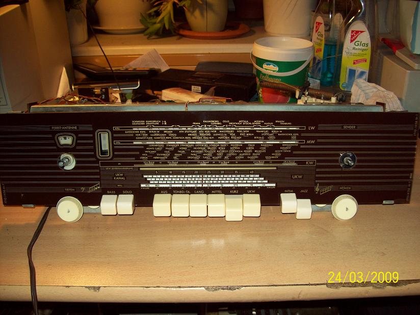 etwas Zeit ist vergangen, und der alte Telefunken hat sich schon ein kleinwenig verändert. Die Innenreinigung wurde wie bei mir üblich, schön gründlich durchgeführt, das alte total versiffte Frontpapier hab ich mit einer kleinen Tube Acrylmalfarbe und einem Pinselchen bearbeitet, die feinen Pinselstriche im zurückgekehrten Weiß geben der Sache sogar eine besondere Note