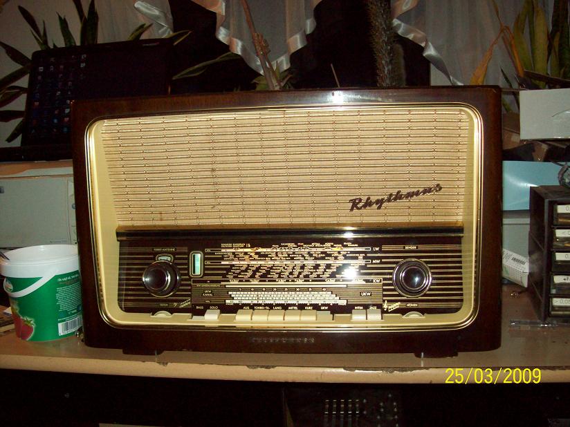 Telefunken Wechselstromsuper Rhythmus 9 Schaltplan vorhanden: ja, war in der Rückwand Gerätezustand: ca1kg Staub, ansonsten unverbastelt, komplett, leicht rissiger Lack. Röhren: ich hab jede der verbauten Röhren vorrätig.