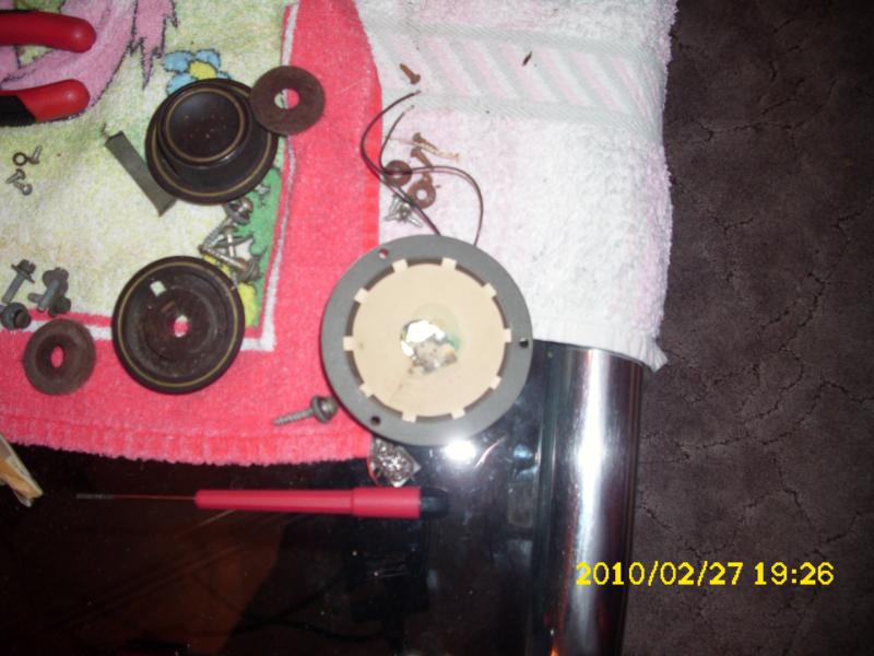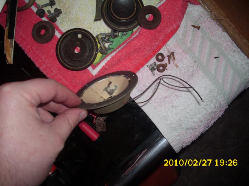 Also mitgenommen und erstmal aufgemacht. HOLLA was für'n schickes Innenleben. Aber soviel Staub Also erstmal die Technik aus dem Gehäuse gebaut und gesäubert. Danach gleich mal das Gehäuse wieder auf Vordermann gebracht. OK das is fertig, weiter gings mit der Technik. Nachdem der ganze Staub entfernt war und ich keine Beschädigungen oder ähnliches finden konnte, mal ausprobiert. JA klingt ganz gut, aber irgendwie so dumpf. Mal am Klangregler drehen, wurde dumpfer aber nicht heller. Also habe ich mir mal die Lautsprecher angekuckt. Ohje der Hochtöner ist völlig grün und vergammelt, es war sogar schwarzer Schimmel drann. Aber das ist ja nicht so schlimm, das läßt sich ja bestimmt wechseln. mmhh ja leichter gesagt als getan, was ist das überhaupt für ein Lautsprecher ? Eine richtige Membrane gibt es ja nicht und eine Spule ebenfalls nicht.