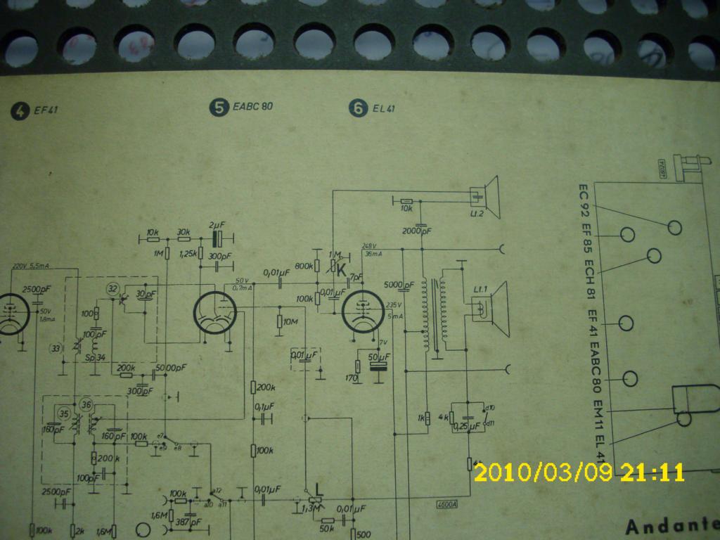 Hallo Wolfgang, dann ist das die Lösung. Der Andante hat einen Kristall-Hochton-Lautsprecher. Wie Du schon erwähnt hast, kann man das am Schaltbild so nicht erkennen. Das sieht im ersten Anschein nach einem Kondensator-Lautsprecher (Elektrostaten) aus - obwohl: Zumeist wird ja Elektrostaten auch eine Gleichspannungs-Komponente zugeführt, die hier ja fehlt. Erst die Schaltungsbeschreibung schafft völlige Klarheit. Die Kristallhörer waren im Vergleich zu den elektrostatischen Lautsprecher selten im Einsatz. Sogesehen ist der Andante eine Besonderheit.