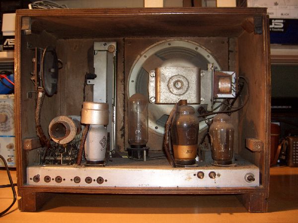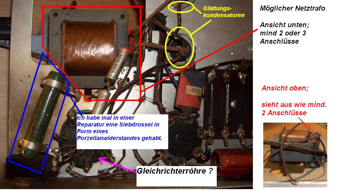 Hallo zusammen, das Gerät (Röhrenbestückung und Heißleiter) weist unbedingt auf ein Allstromgerät. Auch die genauere Betrachtung der Eisenkern-Induktivität weist auf Siebdrossel. Die zwei Leitungen der Drossel liegen doch wohl zwischen den Netz-Elkos. Sollte die Drossel aber mehr als zwei Anschlüße (nicht Lötpunkt) haben, wird es wohl eher ein Trafo sei, aber auch ein Trafo kann als Siebdossel genutzt werden. Irgendwie sieht das Ding dort nicht original aus. Vielleicht ist das ganze Gerät ein schlimmer Umbau, dann kann alles möglich sein. Aber die Röhren passen nicht zu einem Wechselstromgerät.