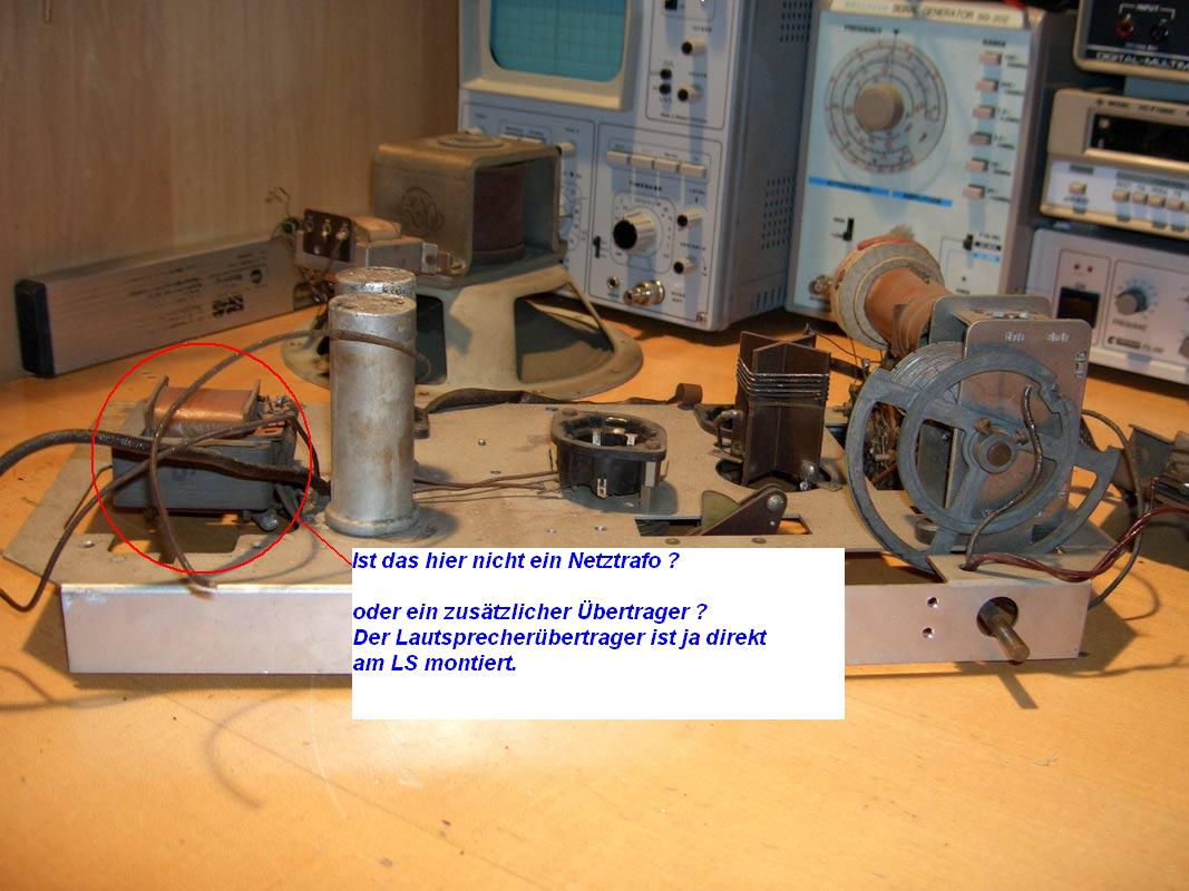 Der Trafo könnte eine Siebdrossel sein. Das beißt sich zwar mit der Angebe im RM, daß ein elektrodynamischer Lautsprecher eingebaut ist, aber auch im RM darf man nicht alle Angaben kritiklos glauben. Leider ist auf den Bildern von Friedrich die Ausführung des Lautsprechers nicht eindeutig zu erkennen. Beim Einsatz von Netztrafos im Radio gibt es drei Möglichkeiten. Der Netztrafo stellt nur über die Sekundärwicklung die Heizspannung bereit, die Anodenspannung kommt aus dem Netz. Der Netztrafo ist als Spartrafo aufgebaut und dient mit Abgriffen der Primärwicklung zur Heizung der Röhren. Die Anodenspannung kommt direkt aus dem Netz. In beiden Fällen haben wir ein nicht!!! netzgetrenntes Gerät, welches wie ein Allstromgerät mit der gebotenen Vorsicht zu betreiben ist. Ein Vorteil dieser Lösungen ist, daß die Anodenspannung über die Primärwicklung hochtransformiert werden kann. Das sichert auch bei 110 Volt Netzspannung die volle Leistung des Empfängers. Die Bereitstellung aller Betriebsspannungen wird über Sekundärwicklungen eines Netztrafos realisiert. Diese Geräte haben keine galvanische Verbindung mit dem Netz, sind also vollständig netzgetrennt. Diese Netztrennung ist die notwendige Vorraussetzung zum gefahrlosen Betrieb von Bandgeräten, Plattenspielern oder anderen Signalquellen am Radio.