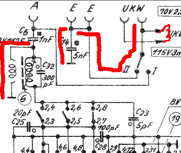 Der Antennenanschluss ist über einen Koppelkondensator 1nF mit dem ZF Sperrkreis verbunden. Da dieser Sperrkreis einseitig an Masse liegt, muss der Koppelkondensator im dümmsten Fall die Netzspannung von der Antenne fern halten. Abdecken geht nicht, also muss ggf. Ersatz her.