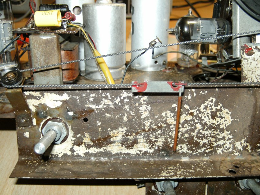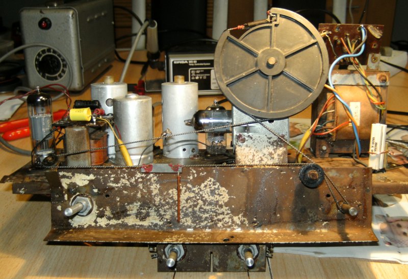 Das Radio hat den Test bestanden. Gut 3 Std. Dauerbetrieb ohne Auffälligkeiten. Jetzt mal überlegen wie es weitergeht, es hat ja keine Eile Für den fehlenden Netzschalter; der war übrigens schon vorher durch einen "Schnurzwischenschalter" ersetzt worden hab ich schon eine Idee. Ein Ersatz durch einen original Druckschalter ist nicht möglich, keine Experimente bein 230 V. Es werden einige Dinge extra für dieses Radio bestellt werden müssen. Am Gehäuse sind sämtliche Zierleisten aus Metall angerostet, aber erstaunlicherweise hat der Netzteilelko alles gut überstanden, ebenso die teilweise offenen Potis. Die Empfangsleitung ist die eines Mittelklasse (LMK) U Supers aus dieser Zeit, ich würde sie als Gut bezeichnen.