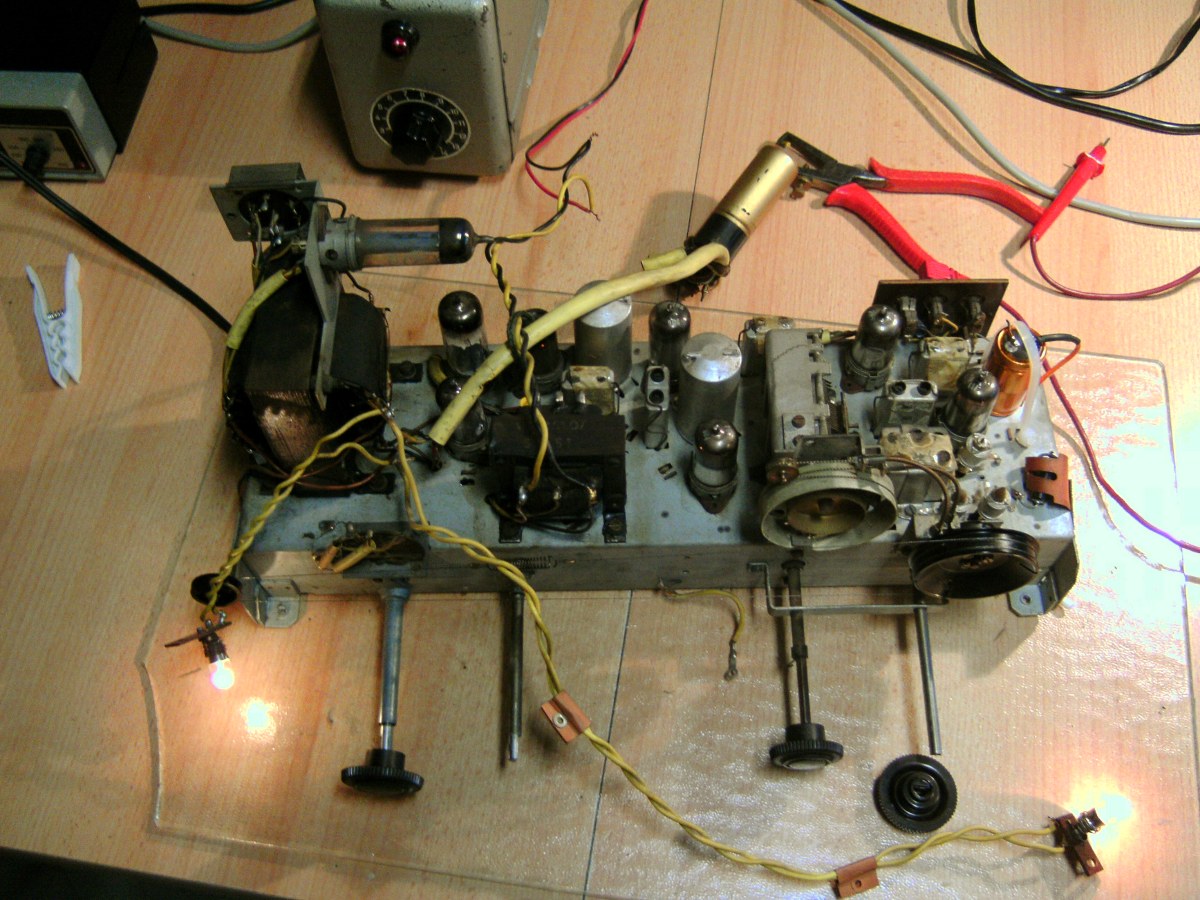 Vor einiger Zeit habe ich das Chassis eine Philips Saturn 51 "Chemisch gereinigt" . Jetzt habe ich die Betriebsfähigkeit grundsätzlich wieder hergestellt. Auf MW dudelt der Ortssender WDR 2 erstmal ein paar Stunden, mit Aufsicht. Auf UKW ist nicht viel los, aber das kommt später. Da ist noch viel zu tun.