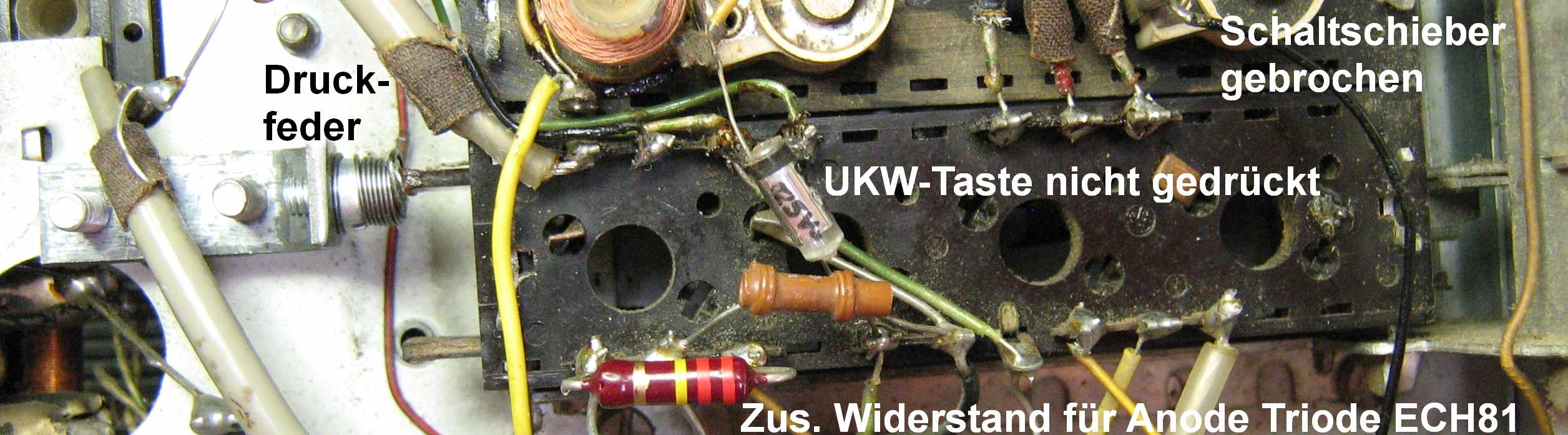 Nebenher: Der 220k-Widerstand wurde von mir nachgerüstet. Er liefert auch bei UKW-Betrieb einen kleinen Anodenstrom für das Triodensystem der ECH81 und verzögert bzw. verhindert damit die gefürchtete Zwischenschichtbildung in der Kathode, was zu ihrer Ermüdung führt.