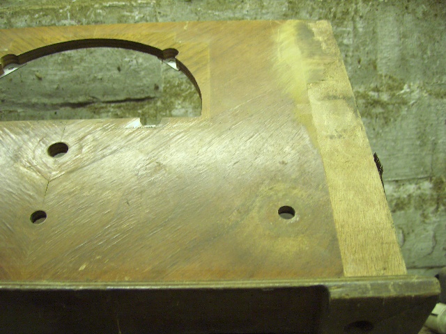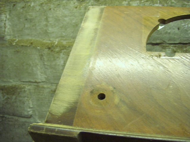 Durch die Maserung des neuen Furniers muß man schon beide Streifen ersetzen. An der Vorderfront hat das Furnier kleinere Falten geschlagen. Hier hat der Leim nachgegeben. Seitlich rechts ist das Furnier in der Mitte sehr lose. In der Mitte ist ein Riss.