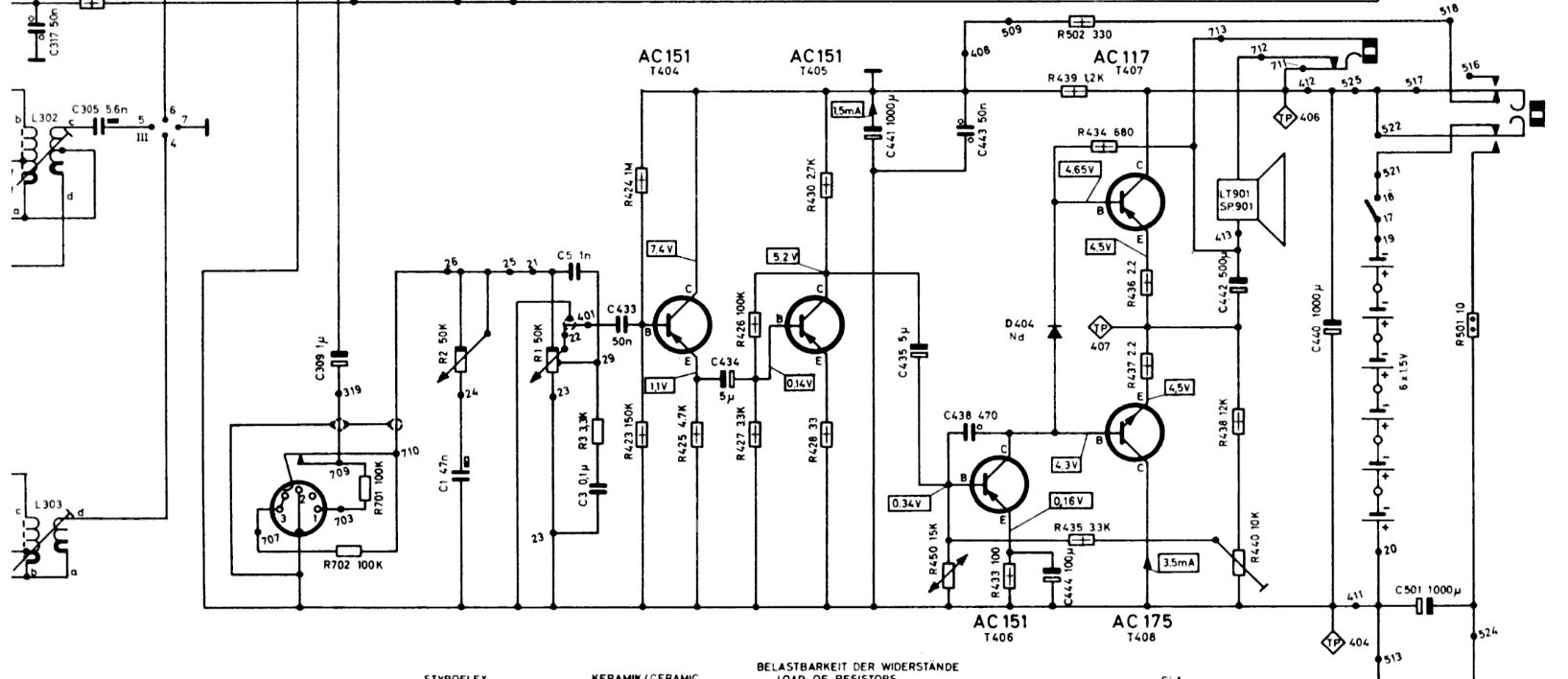 Die Spannungen sind zur Produktionszeit des Radios mit einem Instrument gemessen wurde, das einen geringeren Innenwiderstand aufwies. daher die Abweichung. Zwecks C435 benötigen wir einen Schaltungsauszug um dessen Funktion heraus zu finden, erst danach wäre eine Prüfmöglichkeit ohne dessen Ausbau zu empfehlen