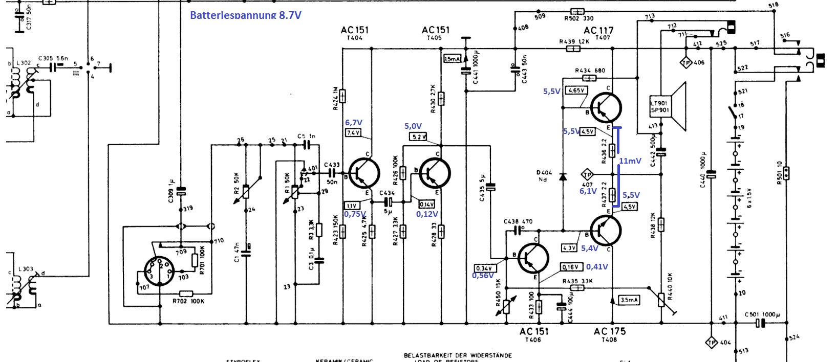 Die gestern gemessenen und die heute noch von Dir erwähnten Spannungen habe ich blau eingetragen. Die Batteriespannung lag bei ca 8,7V. Gemessen hab ich jeweils gegen Batterie+ (natürlich bis auf die Emitter-Differenz) und bei ganz runtergeregelter Lautstärke.