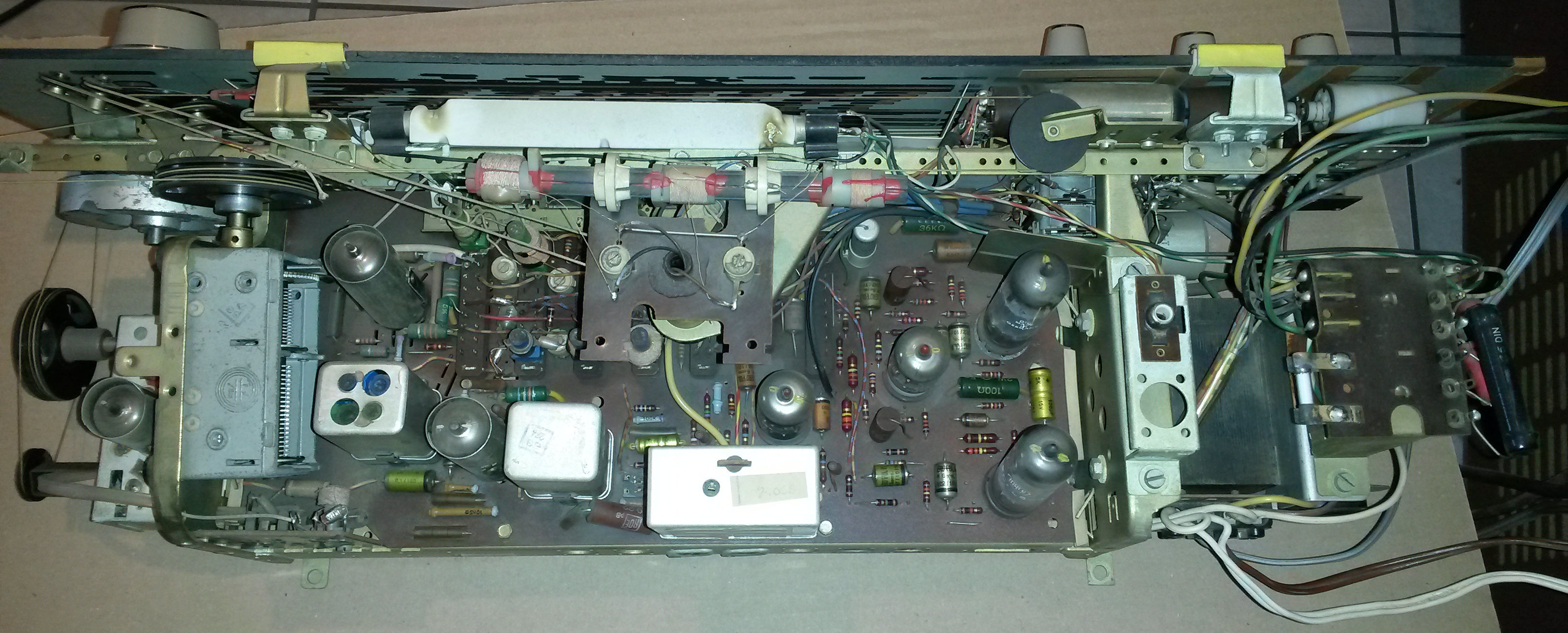 - Keine sichtbaren Schäden an der Verkabelung - Das Gerät beinhaltet 8 Röhren von denen die nicht mit einer Metallmanschette abgeschirmten äußerlich alle einen unbeschädigten Eindruck machen(keine Risse und keine partiellen weißen Verfärbungen z.B. der Verspiegelung). - Ein Axial-Elko (15V und 100uF vielleicht ein Kathodenelko?) in der Nähe der beiden ECLL800-Röhren ist defekt(herausgedrückte Isoliermasse und nicht ganz frische Spuren von Hitzeentwicklung an einer Seite). - Die Trafos weisen von außen keine Spuren von Hitzeeinwirkung auf, allerdings sehen die Eisenkerne der beiden kleineren Trafos etwas korodiert aus(das könnte aber auch nur eine Lackschicht sein). - Die Heizungssicherung ist nicht durchgebrannt. - Es gibt hinten am Gerät einen Drehschalter zur Netzspannungseinstellung, in dem laut Mini-Lageplan die allem Anschein nach funktionstüchtige Netzsicherung steckt. - Der große Siemens Becherelko (B43230, 350-385V, 50+50uf) ist nicht ausgelaufen. - Ich kann spontan keine abgerissenen Bauelemente/Drähte oder mechanisch defekte Lötstellen ausmachen. - Die Mechanik des Radios wie Schalter, Seilzüge und Drehkondensatoren macht einen durchweg sehr guten Eindruck. Alles ist sauber, leichtgängig, nicht verharzt und nichts klemmt. - Die Kunststoffabdeckung über den Skalenlampen hat Hitzeverformungen. - Auf den ersten Blick kann ich keine Papier- oder Teerkondensatoren entdecken. - Die Lautsprecher sind weder verdreckt noch offensichtlich beschädigt. - Der Plattenspieler ist ein separates Gerät und deshalb nicht beeinträchtigt. - Die Röhre mit der funktionierenden Heizung ist eine ECC83. - Von den ECC83 und ECLL800 Röhren sind jeweils zwei vorhanden, so dass bei einem dort vermuteten Defekt Tauschmaterial vorhanden wäre. - Die EMM 803 Anzeigeröhre sieht etwas aber gleichmäßig milchig aus(vielleicht funktional bedingt, da scheint es komplett milchige und nur auf der Anzeigeseite milchige zu geben).