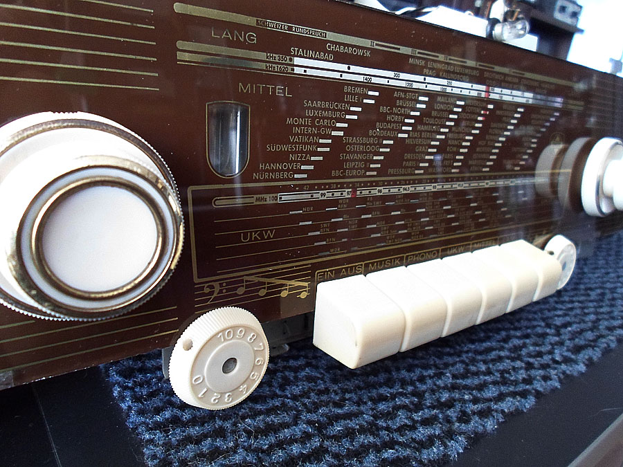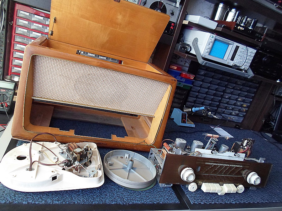 die "Magische Auge" ist sehr schwach und muss erneut werden; der Lautsprecher in die Mitte passt überhaupt nicht; fehlen die Fassungen für die Skala Lämpchen; UKW läuft nur 5 - 7 Minuten, und dann ist der Ton weg; Plattenspieler braucht grundsätzliche Reparatur; Ton Regler (Höhe) funktioniert nicht.