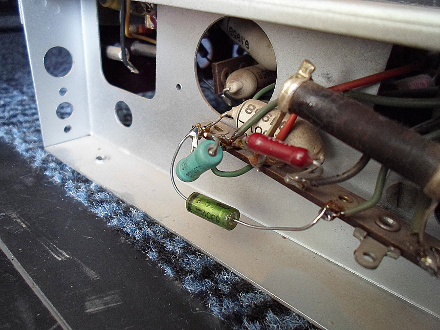 Trotzdem habe ich im ausgetauscht, und jetzt war alles OK. Kein Rauch. Aber ich habe Vermutung das so ein Spannung konnte die Hochton-Lautsprechern beschädigen. Nach Ausmessung hat das gezeigt, das ist so. Die beide sind kaputt. Dann habe ich Widerstand und Kondi eingelötet, um das Radio durchprüfen.