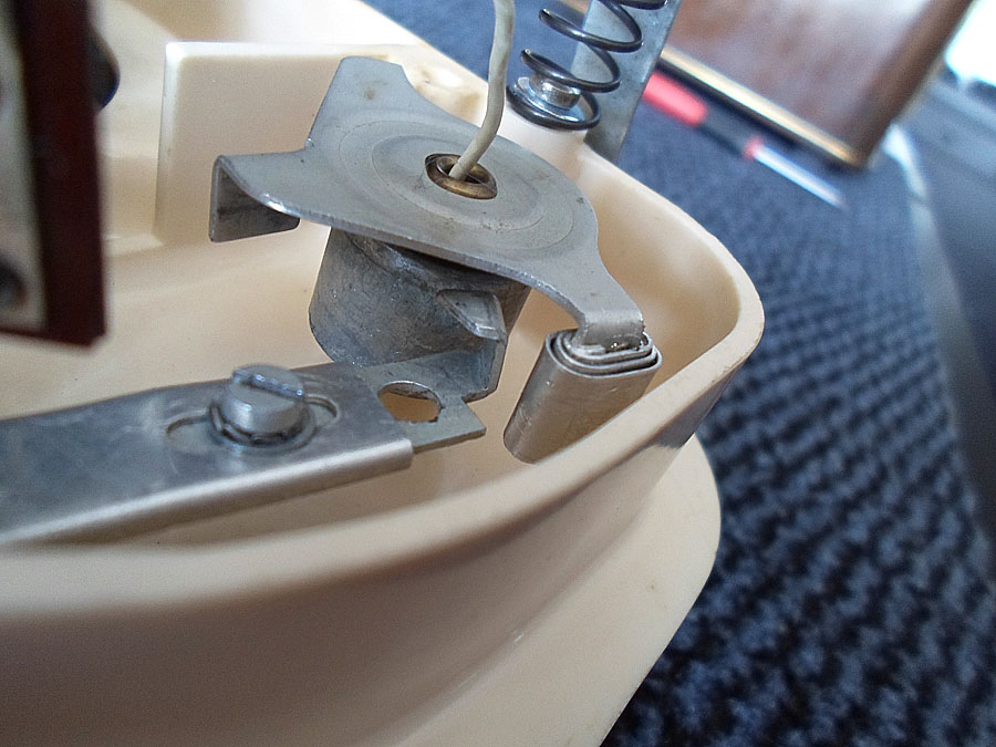 jetzt kann ich anfangen mit dem Plattenspieler. Da ist schon bisschen was. Erst mal fehlen alle vier Druckfedern mit die ist der Plattenspieler auf dem Gehäuse befestigt. Ich muß die ganze Konstruktion selbst entwickeln und basteln. In Internet habe ich leider keine Bilder von diese Teil des Radios gefunden. Dazu habe in Bauhaus die nach meine Meinung, passende Druckfedern gekauft mit Schlagscheiben. Als Probe habe ich erste Feder fertig. Da wird noch ein Bügel fehlen; aber das später.