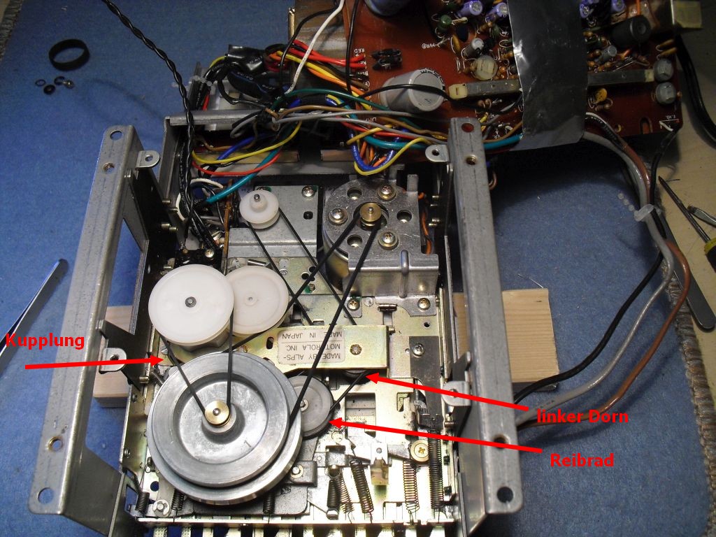 hallo, bitte um einen hilfreichen Rat: bringe ein Rosita CR400 wieder in die Gänge, hänge jetzt aber fest am Kassettenrecorder Typ CW8 Alps/Motorola. Da waren alle Riemen unbrauchbar bis aufgelöst- Geschichte - letztes zu lösendes Problem: schneller Rücklauf funktioniert nicht. Schwungrad läuft, Kraft wird zur Spulenaufnahme gebracht und diese dreht nicht mit, weil die rechte aktive Aufnahme sich nicht mitziehen lässt. Beim schnellen Vorlauf aber zieht diese selbst und problemlos - nur beim Rücklauf wird sie gezogen und da geht dieser Mechanismus offensichtlich zu schwer - was kann das Problem sein?