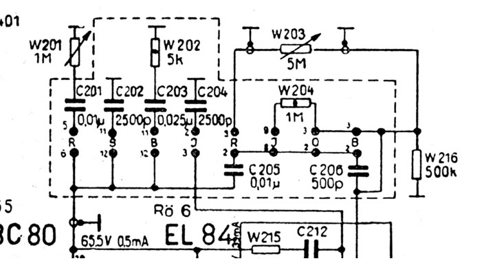 mal eine Frage an die Soundexperten. Leider kann ich die Klangregelstufe im Schaltbild nicht so richtig lesen. Mein Problem: Ich möchte aus dem Radio ein paar mehr Höhen rausholen. In der Stellung "Jazz" sind die Höhen ziemlich gut, jedoch keine Bässe vorhanden. In der Stellung "Orchester" habe ich schöne Bässe, jedoch zu wenig Höhen. In der Stellung "Regler" sind die Bässe gut einstellbar, die Höhen reichen mir aber nicht. Meine Frage: Welchen Kondensator müsste ich wie verändern, dass ich bei Stellung "Regler" mehr Höhen bekomme.