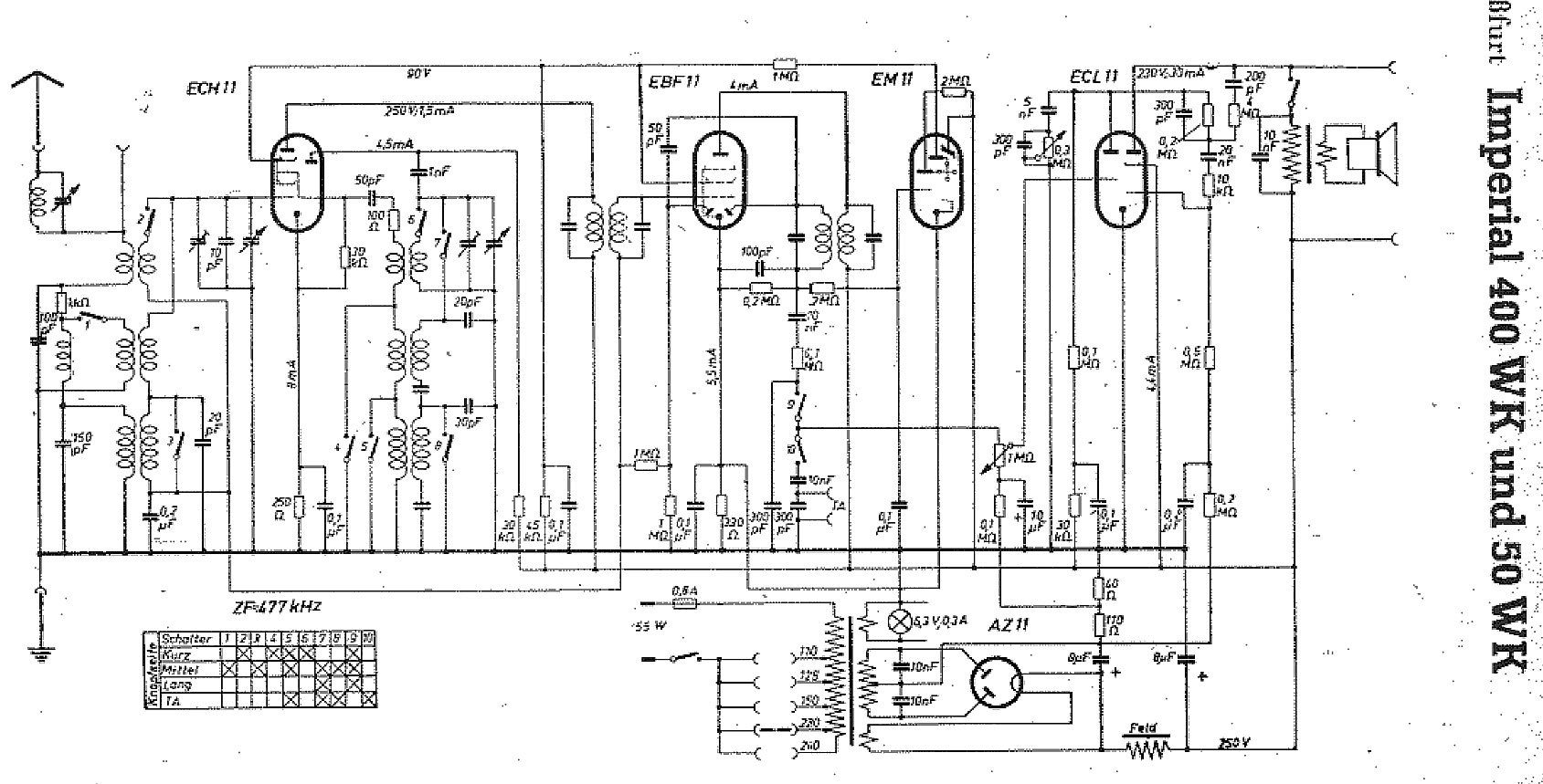 Ich habe neulich ein wunderschönes Imperial Stassfurt 50WK für Restauration erworben. Bevor was mit Restauration anzufangen, habe ich das Radio in Netz eingeschaltet. Da kämm nur leichtes Geräusch. Optisch war alles OK. Nach dem, als ich habe die Spannungen ausgemessen, konnte ich fest stellen, dass Anodenspannung liegt bei ca. 180V, statt 230V. Austausch von Röhren hat nichts geändert. Siebelkos sind auch OK. Aber was ist interessant, und für mich ist auch ein Rätsel: nach dem Einschalten, Anodenspannung springt sofort auf ca. 340V, aber dann langsam sinkt auf 180V. Es dauert ca. 1 Minute. Wenn ich ziehe die ECL11 raus, springt das Spannung wieder auf 230V. Und was noch interessanter - wenn ich gebe ein Signal auf Eingang NFV (Gitter ECL11), sofort erhöht sich Spannung bis 230V! Das verstehe ich nicht. Kann mir jemand erklären was das ist und wo kann die Problem liegen?