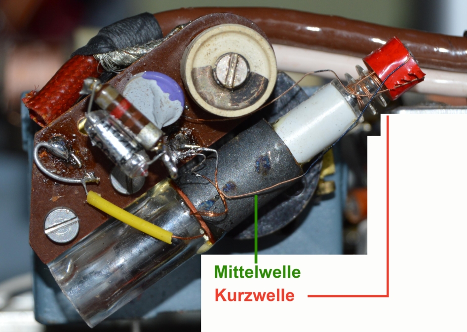Zuerst folgte ich der Empfehlung von wumpus und drehte das Gerät voll laut nachdem ich den Lautsprecher wie empfohlen ca. 2 Meter vom Gerät aufgestellt hatte. Der Fehler trat nicht auf. Danach klopfte ich mit dem Schraubendrehergriff die Bauteile vom Gerät ab. Dabei stellte ich fest, dass die Mikrofonie am stärksten an einem auf der Rückseite des Drehkondensators angebrachten Variometer auftrat. Das Variometer besteht aus 2 Spulen, wobei eine Spule den HF Zwischenkreis für Mittelwelle und die andere Spule den HF Zwischenkreis für Kurzwelle darstellt. Die Abstimmung der Spulen erfolgt durch 2 Ferritkerne, wobei der Kern für Kurzwelle mit einem Kunststoffsteg an den Mittelwellenkern angeklebt ist. Diese Klebestelle hatte sich gelöst, wodurch sich der Kurzwellenkern unkontrolliert bewegen konnte. Je nach Lage des Kernes wurde die HF Vorstufe so verstimmt, dass diese zu schwingen begann und der Mikrofonieeffekt auftrat. Nach kleben der Verbindung funktionierte das Gerät wieder einwandfrei.