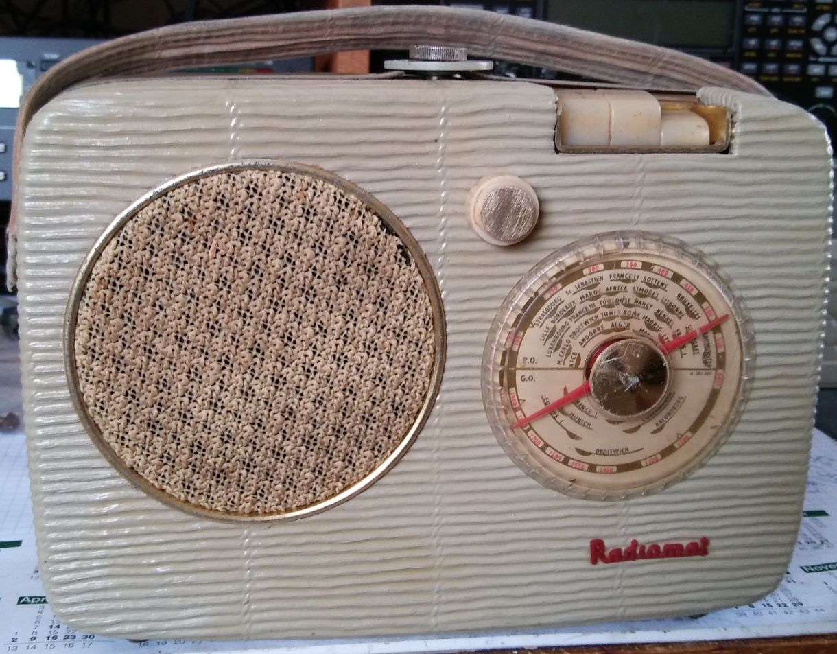 GeorgK hat dankenswerterweise über ein französisches Forum die Identität geklärt: Es handelt sich um das Gerät "Radiomatic Portatif 695" der S.F.R.T., Société Française de Radio et Télévision. Es wurde im Sommer 1958 in den Handel gebracht und es existierten 7 sehr ähnliche Derivate unter anderen Markennamen. Ein identischer Schaltplan konnte auch auf der französischen Webseite heruntergeladen werden, entsprach aber in wesentlichen Punkten NICHT der Realität.