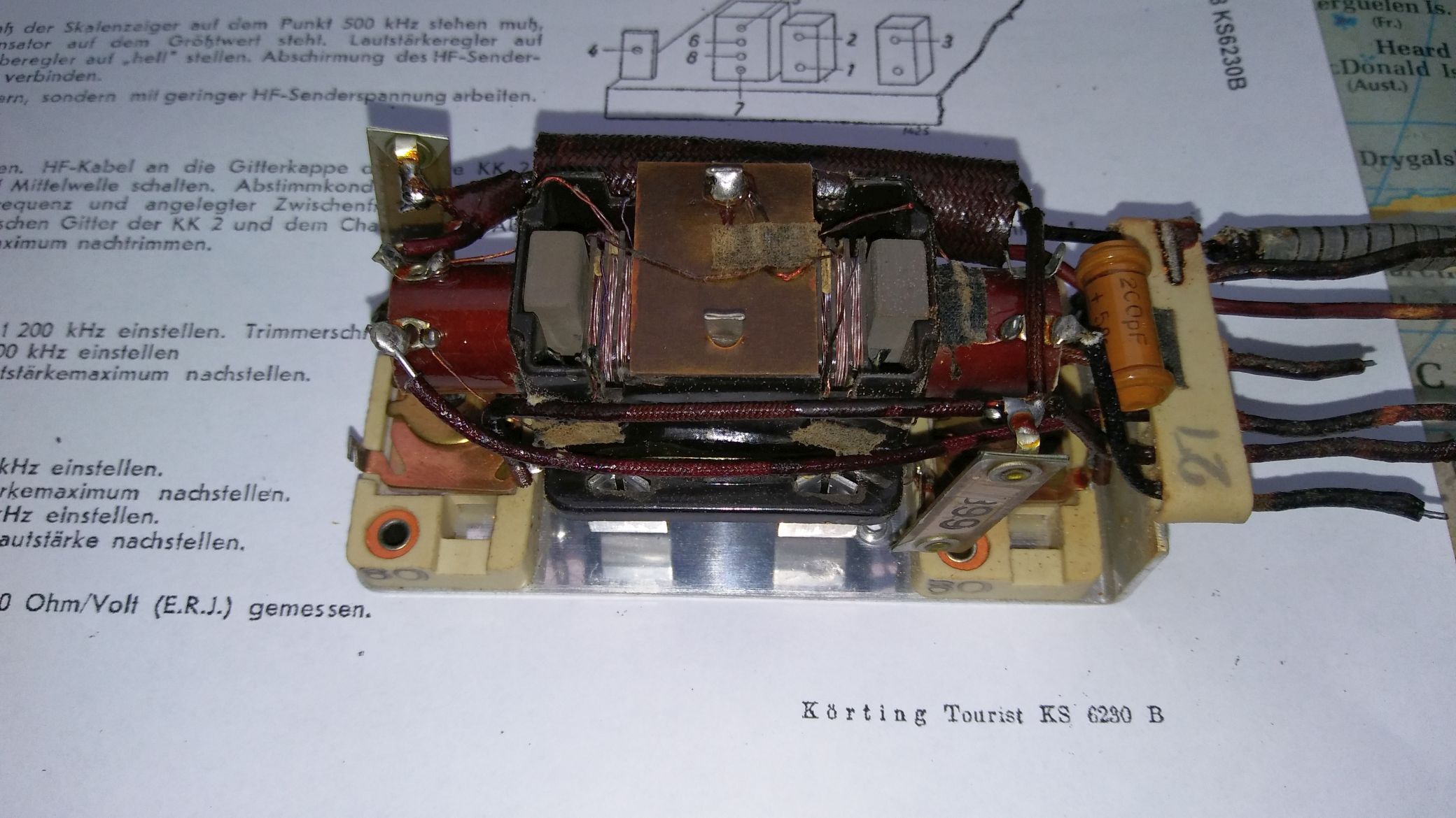 Es ist noch erwähnenswert, dass man für eine erfolgreiche Restaurierung des Körting Tourist auch den für LW/MW abgeschirmten und umschaltbaren Eingangs-/Oszillatorkreis demontieren und öffnen muss. Bei der Prüfung der Komponenten fiel auf, dass der Gitter- ableitwiderstand zum Gitter 1 der Mischröhre unterbrochen und der 1000cm Teerkonden- sator erwartungsgemäss fehlerhaft war. Zur Einstellung des Gleichlaufs zwischen Eingangs- kreis und Oszillator wird der Kreisinduktivität eine geschlitzte Alu-Scheibe dem Kern über ein Gewinde angenähert. Eine der beiden Scheiben (hier LW) hatte sich gelöst und erlaubte keinen Abgleich mehr. Die beiden Glimmer-Keramiktrimmer sind hochwertig und sollten dauerhaft funktionieren. Sie haben eine Endkapazität von 60pF, wobei dem Lang- wellenkreis ein 200pF-Fest-Rohrkondensator parallel liegt. Ich erwähne das, weil das aus den Schaltplänen nicht hervorgeht. Die Kreisinduktivitäten betragen 140+80 µH, die Koppelwicklungen in der Summe zum Gitter 2 etwas über 10µH.