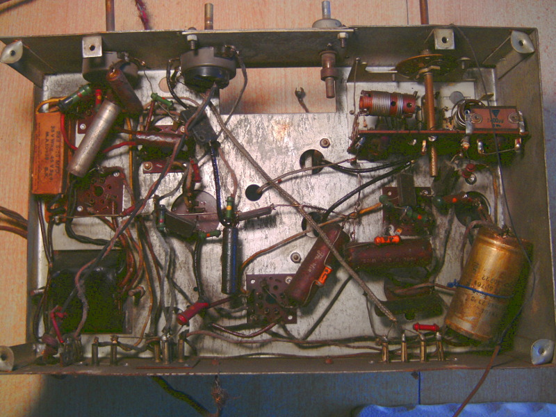 Es gab mal den Thread "Das ist ja die Höhe" Damit waren Radios gemeint die Höher als Breit sind. Meist Teile aus den 30er, 40er. Wollte ich auch mal Ergebnis ein Kauf in UK. Ein Belmont Model 570 Bj. ca 1937. Ein ziemlich großes Teil, leider mit Transportschaden am Gehäuse; werde ein Leidensgenosse von Friedrich Es gibt anscheinend keinen Schaltplan speziell für dieses Gerät, bei Nostalgia Air hab ich was gefunden, das HF Teil scheint zu passen, das NF Teil ist etwas anders. Es war schon wieder eine falsche Endröhre im Gerät. Etwas misstrauisch war ich schon beim kleinen Ausgangsübertrager, eine Messung des Katodenwiderstand der Endröhre brachte Gewissheit statt der 6V6GT kommt da eine 6K6G rein. Leider hab ich beim Ausbau den Lautsprecher zerstört Aber auch die Feldspule des LS war hinüber. Das Netzteil wird neu aufgebaut und für LS wird sich auch was finden. Ganz ehrlich: Ich weis nicht ob ich das schaffe. Bin aber schon fleißig am säubern, entrosten. Das Gerät ist nicht mehr ganz ursprünglich wie man sieht. Die umfangreiche Mechanik muss auch noch wieder aufgebaut werden. Ein paar Fotos, die waren mehr als Baustellenfotos für mich gedacht.''});( { ''});{ ''});