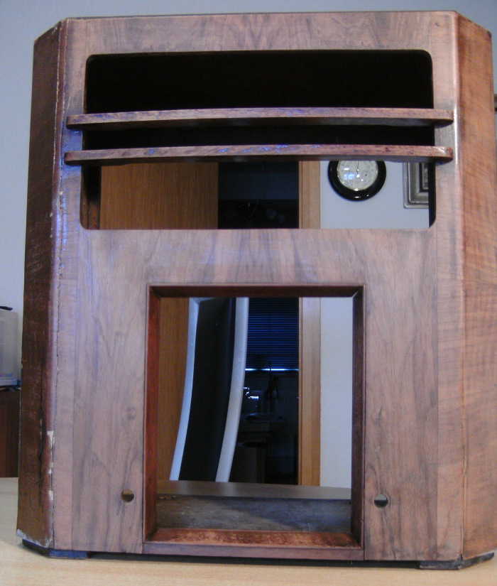 Es gab vom Belmont 570 zwei Ausführungen. Einmal mit Tastenaggregat und eine mit Stufendrehschalter. Letzterer war etwas billiger, den hab ich. Ein schnelles Foto vom Gehäuse zeigt das die Kanten an der Seite abgerundet sind und an der linken Seite ist der Transportschaden. Als erstes wurde das Gehäuse wieder zusammen Geleimt. Jetzt wird der alte Lack mit Aceton und Schleifpapier entfernt. Das Chassis ist schon fast entrostet mit Entroster Gel und Flüssig (Phosphorsäure). Da der LS kaputt ist und die Feldspule auch werde ich die Gleichrichter - Siebkette neu aufbauen. Statt einer 5Y3G eine GZ 34 mit L Eingang, eine 10 H Drossel ist vorhanden, die Elkos auch. Sorge macht mir der AÜ den ich entrosteten musste, aber auch hier ist als Plan B ein 7 K AÜ unterwegs. Für den LS dachte ich an einen neuen Celestion PA 8", kommt auch aus England. Kann nicht immer stringent am Projekt bleiben, noch muss ich arbeiten. :''}); MFG Nobby