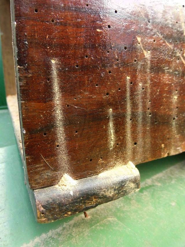 Was ich damals nicht so beachtet habe, da waren viele kleine Löcher zu sehen, wo Holzwürmer ihren Unterschlupf hatten und jetzt immer noch haben